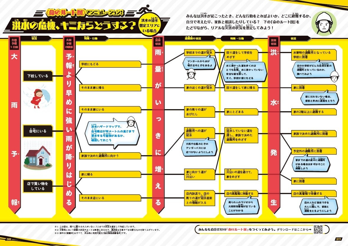 書籍オリジナルページとして、被災直後から安全な場所を確保するまでの避難の過程を自分のこととしてイメージできるように、災害ごとの「命のルート図」(京都大学防災研究所 矢守克也教授監修)を掲載しています。