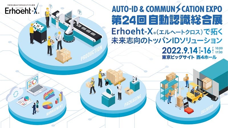 凸版印刷ブース(西4ホール、小間番号A-17)では、「Erhoeht-X®(エルヘートクロス)で拓く未来志向のトッパンIDソリューション」をテーマに、バリューチェーンのDXを「製造」と「物流」の2つの側面から展示、それぞれに最適なサービス・活用事例を紹介します。
