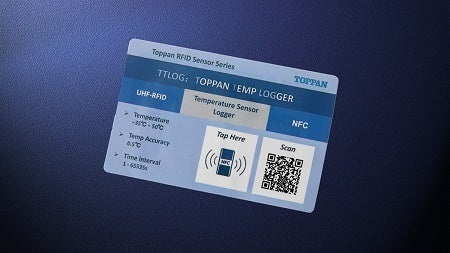 凸版印刷のブースでは、温度ロガーラベルタグとNFC対応スマートフォンを使った温度管理デモを行います。