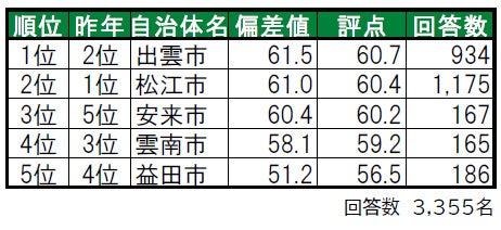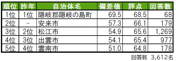 1位は、2年連続で隠岐郡隠岐の島町で、トップ5内で唯一郡部に属する「町」となっています。2位は安来市で、「街に誇りがある」「街に愛着がある」2位、「住み続けたい街」3位と各ランキングで上位に入っています。安来市は、昨年は偏差値が50未満でランキング集計対象外でした。3位は松江市で、「住みここち」「住みたい街」「住み続けたい街」でそれぞれ2位となっています。