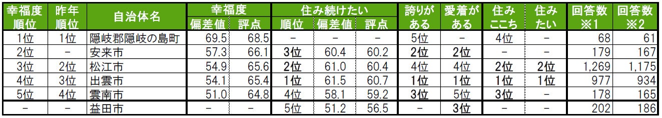 街の幸福度1位は2年連続で隠岐郡隠岐の島町。2位安来市、3位松江市。