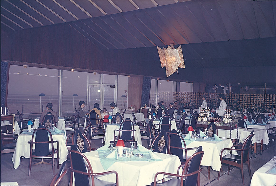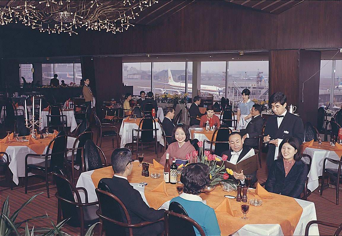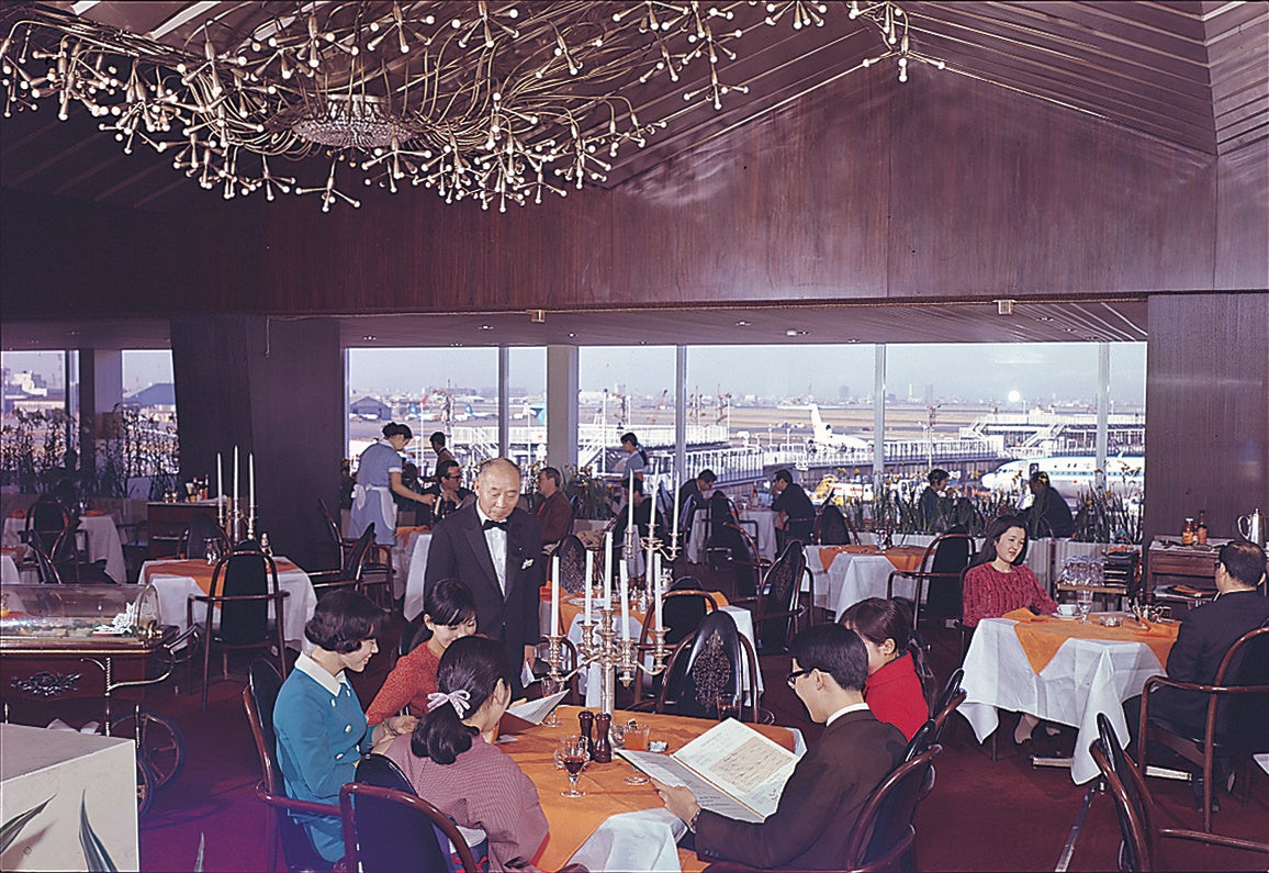 昭和当時の「Grill Avion」内観(年代不詳)。海外アーティストやハリウッド女優も訪れる高級西洋料理レストランで、高い天井にはシャンデリアが煌めき、シェフがワゴンを使いお客様の目の前で料理を仕あげる様子や、テーブルには大きな燭台にキャンドルが灯されている。また、窓の外には駐機している飛行機が見える。同店3代目料理長は今回のバトンタッチを受けて「この頃の羽田空港はエトランジェ(外国)文化の発信地でもあった」と往事を思い返して語っている。