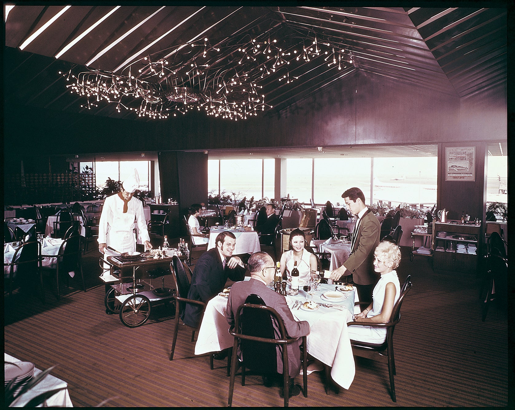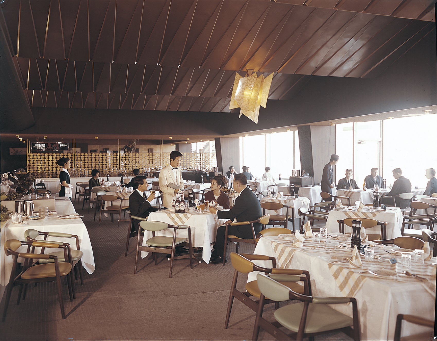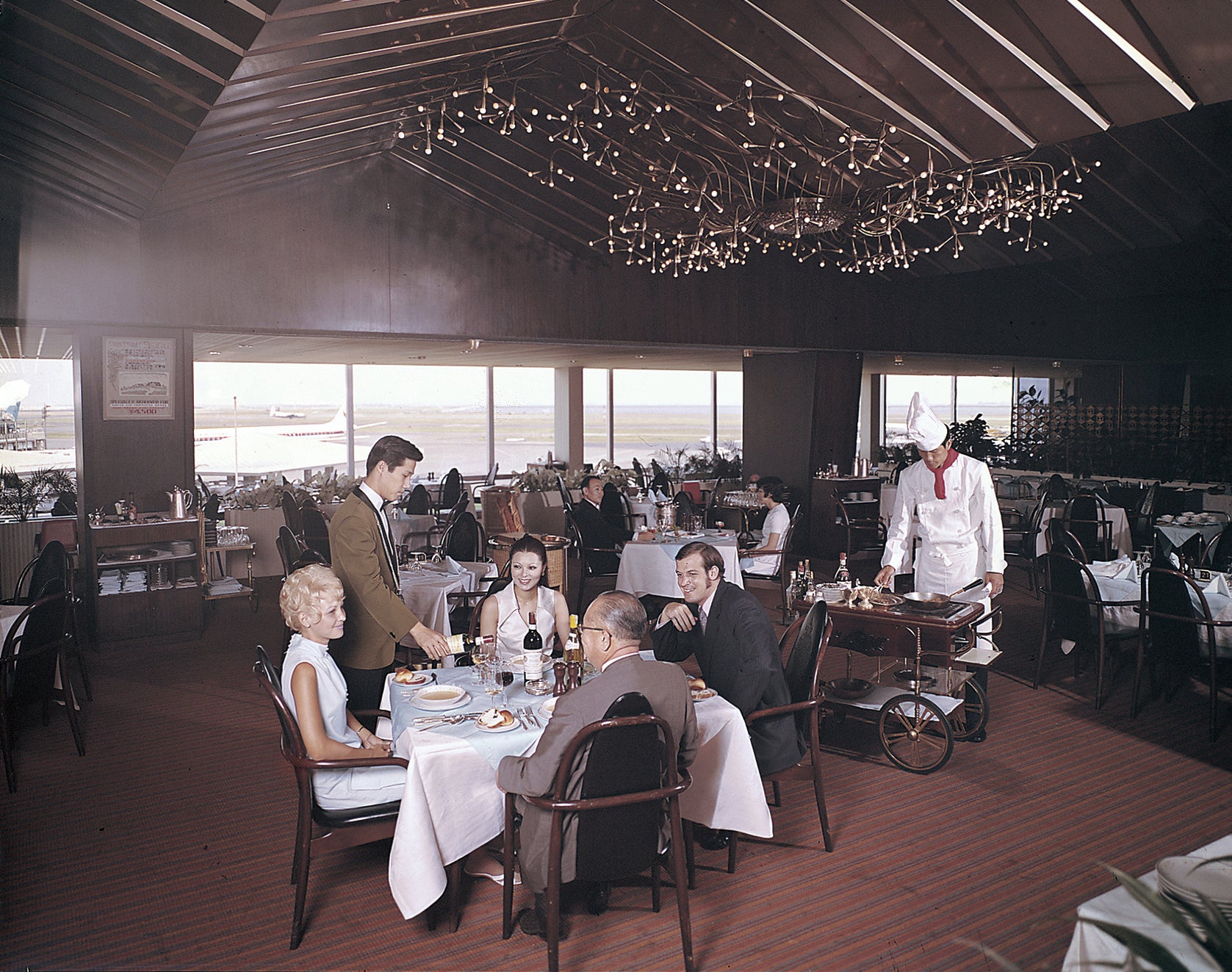 昭和当時の「Grill Avion」内観(年代不詳)。海外アーティストやハリウッド女優も訪れる高級西洋料理レストランで、高い天井にはシャンデリアが煌めき、シェフがワゴンを使いお客様の目の前で料理を仕あげる様子や、テーブルには大きな燭台にキャンドルが灯されている。また、窓の外には駐機している飛行機が見える。同店3代目料理長は今回のバトンタッチを受けて「この頃の羽田空港はエトランジェ(外国)文化の発信地でもあった」と往事を思い返して語っている。