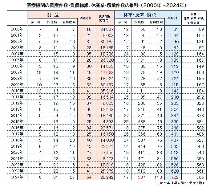 2024年の医療機関(病院・診療所・歯科医院を経営する事業者)の倒産(法的整理、負債1000万円以上)は64件となり、2009年(52件)を大きく上回って過去最多を更新した。