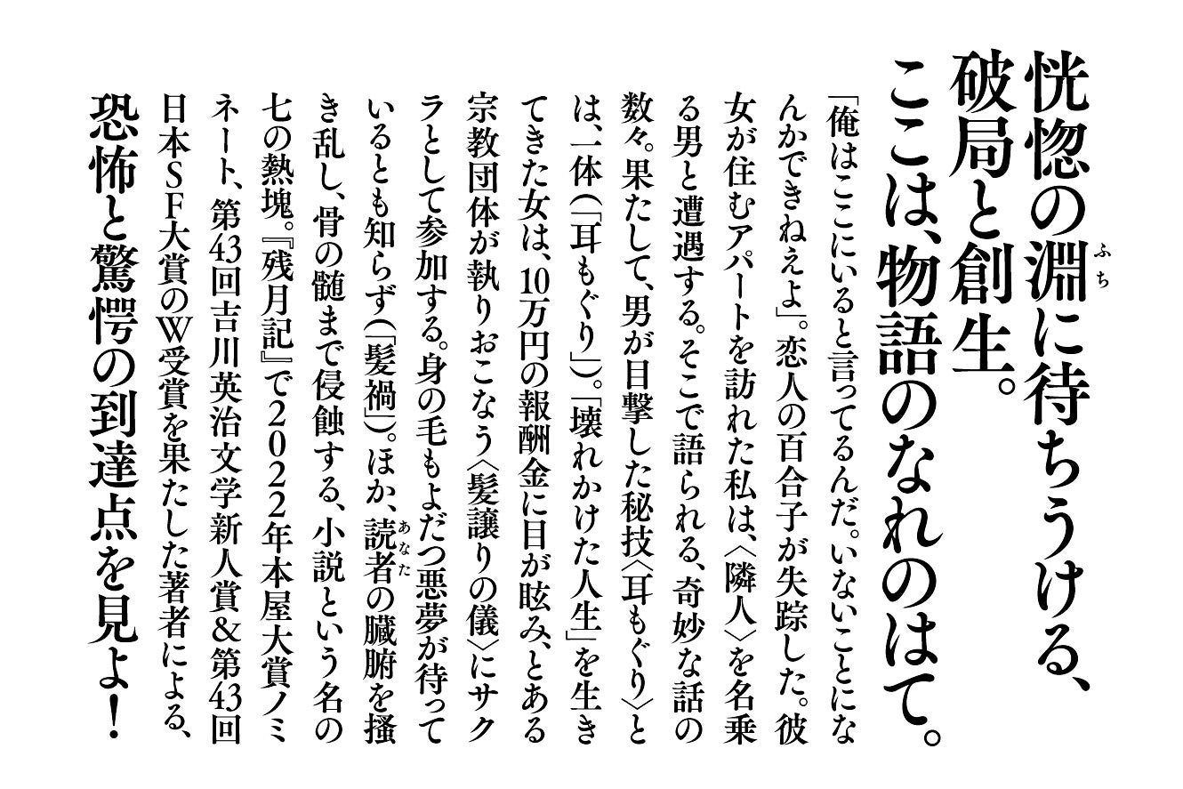 「俺はここにいると言ってるんだ。いないことになんかできねえよ」。恋人の百合子が失踪した。彼女が住むアパートを訪れた私は、〈隣人〉を名乗る男と遭遇する。そこで語られる、奇妙な話の数々。果たして、男が目撃した秘技〈耳もぐり〉とは、一体。