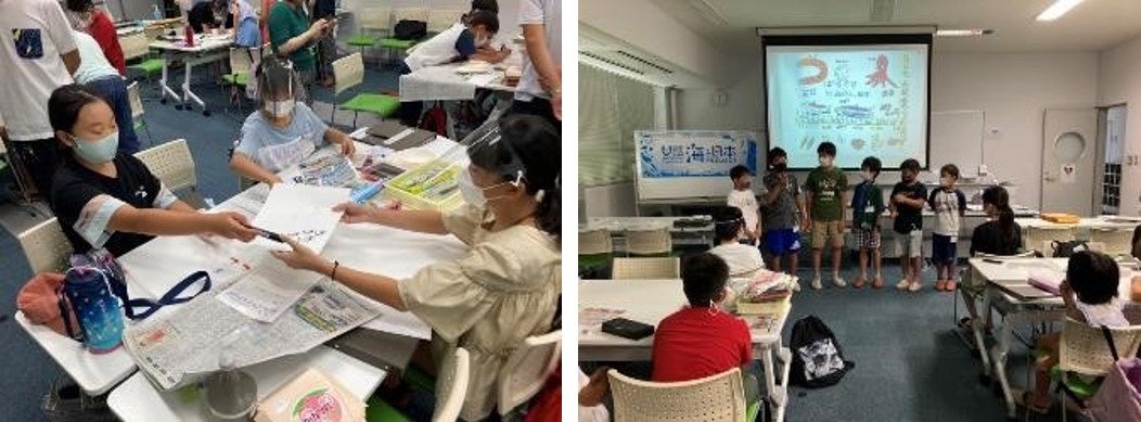 その後、1日目と2日目に学んだことの振り返り学習を実施しました。各自が活動を通して記入してきた調査ファイルや、自宅での復習教材として渡していた学習ノートを見ながら、同じグループの仲間たちと体験学習で学んだことを振り返りました。前回の活動の写真を見ながらの振り返りでは、船から見たアマモ場のきれいさや魚の多さ、水産研究所で行われている栽培漁業の大切さを思い出しながら、活発に意見を交わしていました。子どもたちからは、「アマモの多い豊かな海には魚がたくさんいた」「アマモを守っていきたい」「魚を守っていく研究を将来自分もしたいと思った」という声が聞かれ、美しく豊かな岡山の海をより身近に感じ、自分たちの力で美しい海を未来に繋いでいきたいという素直な気持ちを改めて実感していたようでした。