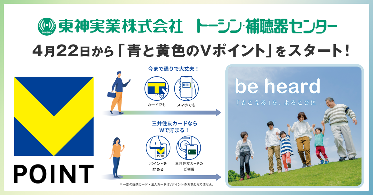東神実業、CCCMKHDおよび三井住友カードは、「トーシン補聴器センター」での「青と黄色のVポイント」のサービスを通じて、これからも多くのお客さまに喜んでいただけるサービスを提供してまいります。