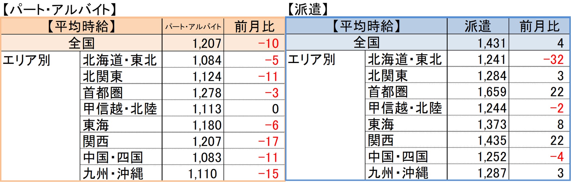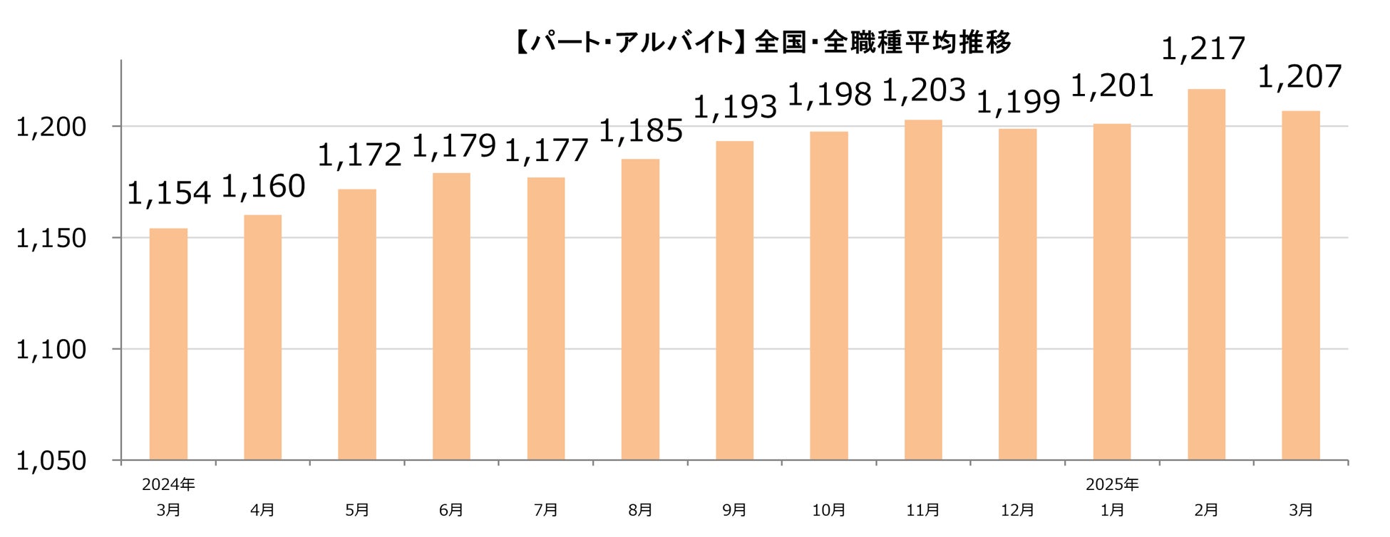 【パート・アルバイト】全国・全職種平均時給は1,207円。前月比-10円。前年同月比+53円。
