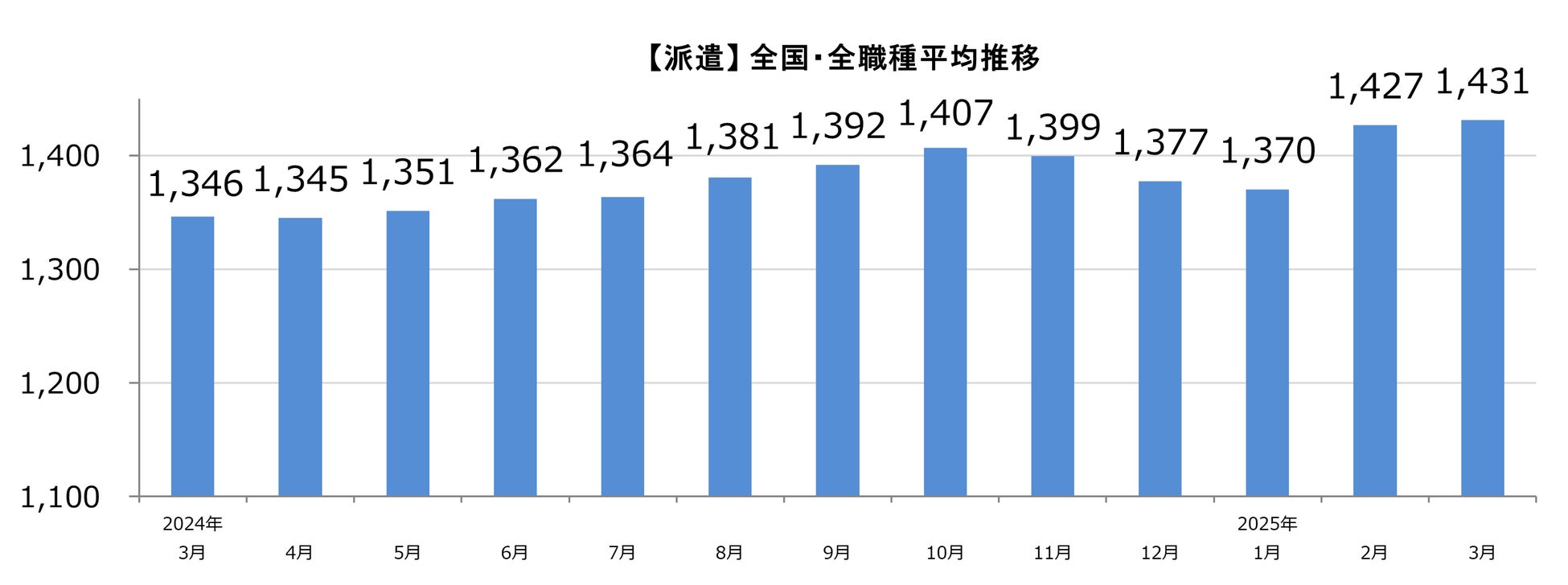 【派遣】全国・全職種平均時給は1,431円。前月比+4円。前年同月比+85円