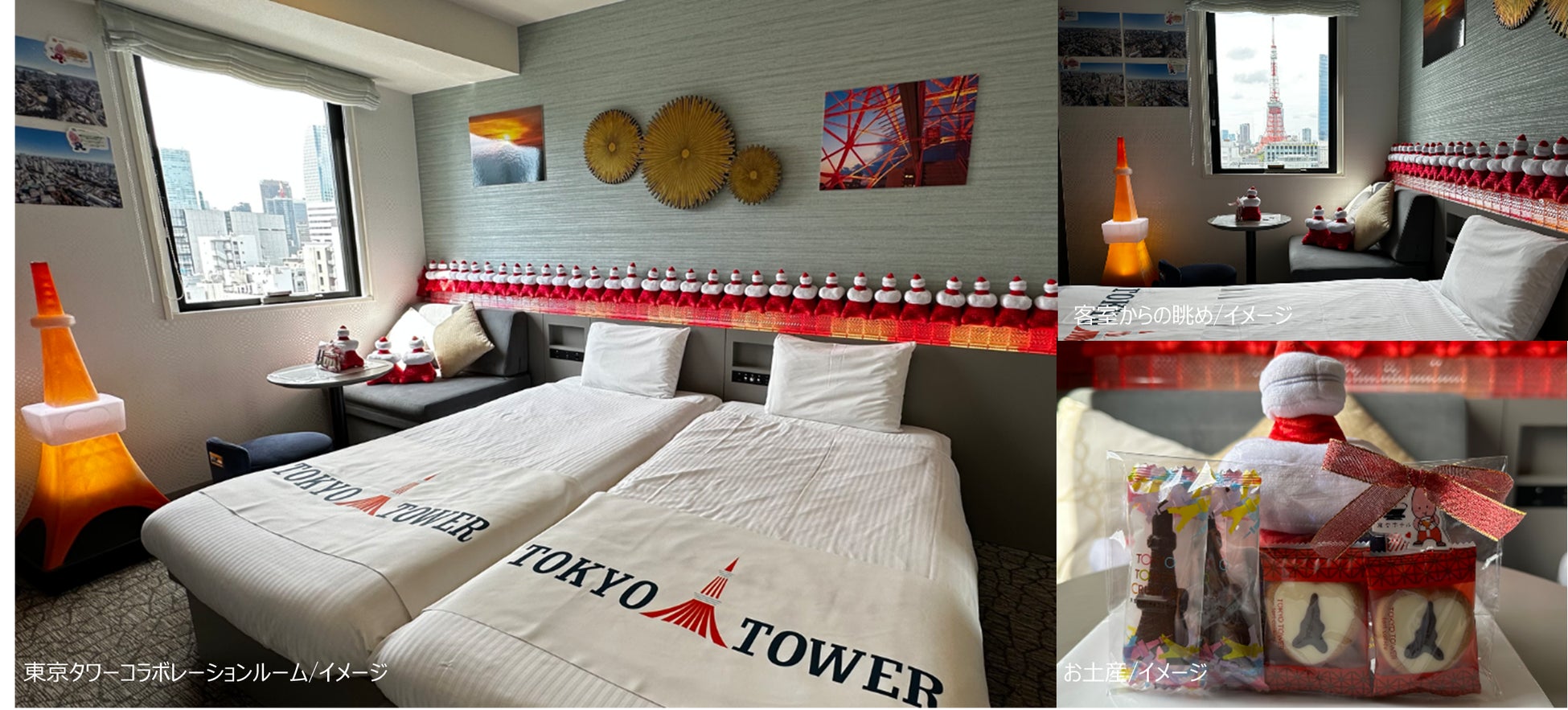 「東京タワーコラボレーションルーム」は、客室の窓から東京タワーがのぞめます。客室を沢山の東京タワーのぬいぐるみやオブジェで飾り、宿泊のお土産として東京タワーのぬいぐるみとお菓子をご用意しております。また、東京タワーメインデッキの入場券も付いており、観光にもぴったりのプランとなっております。ベッドを2台設置したツインタイプの客室で、ソファベッドをご利用いただくと3名様でのご利用も可能です。価格は、素泊まり35,000円~、朝食付37,600円~(いずれも1泊1部屋あたり/2名1室利用/税サ込)