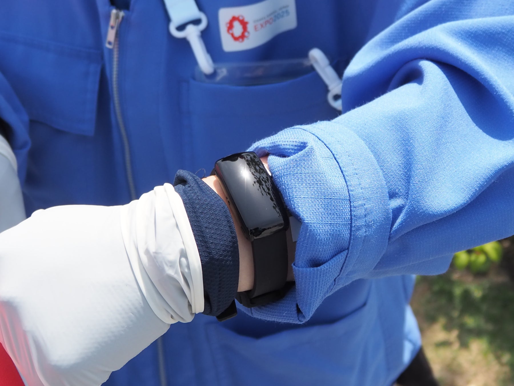 特に、大阪・関西万博の会場内で清掃業務を担当する従業員の健康と安全を守るため、従来の「こまめな休憩」「こまめな水分補給」に加えて、「スマートウォッチ型デバイス」をダスキンでは初導入し、熱中症リスクの可視化を実施します。暑熱リスクの表示をわかりやすく、緑色(正常時)・黄色(注意アラート時)・赤色(警告アラート時)と点灯。黄色や赤色は振動とともにお知らせし、リスクを回避する行動を促します。脈波情報から深部体温の変化をモニタリングすることで、個々のリスク判定を行い、早期対応が可能となります。