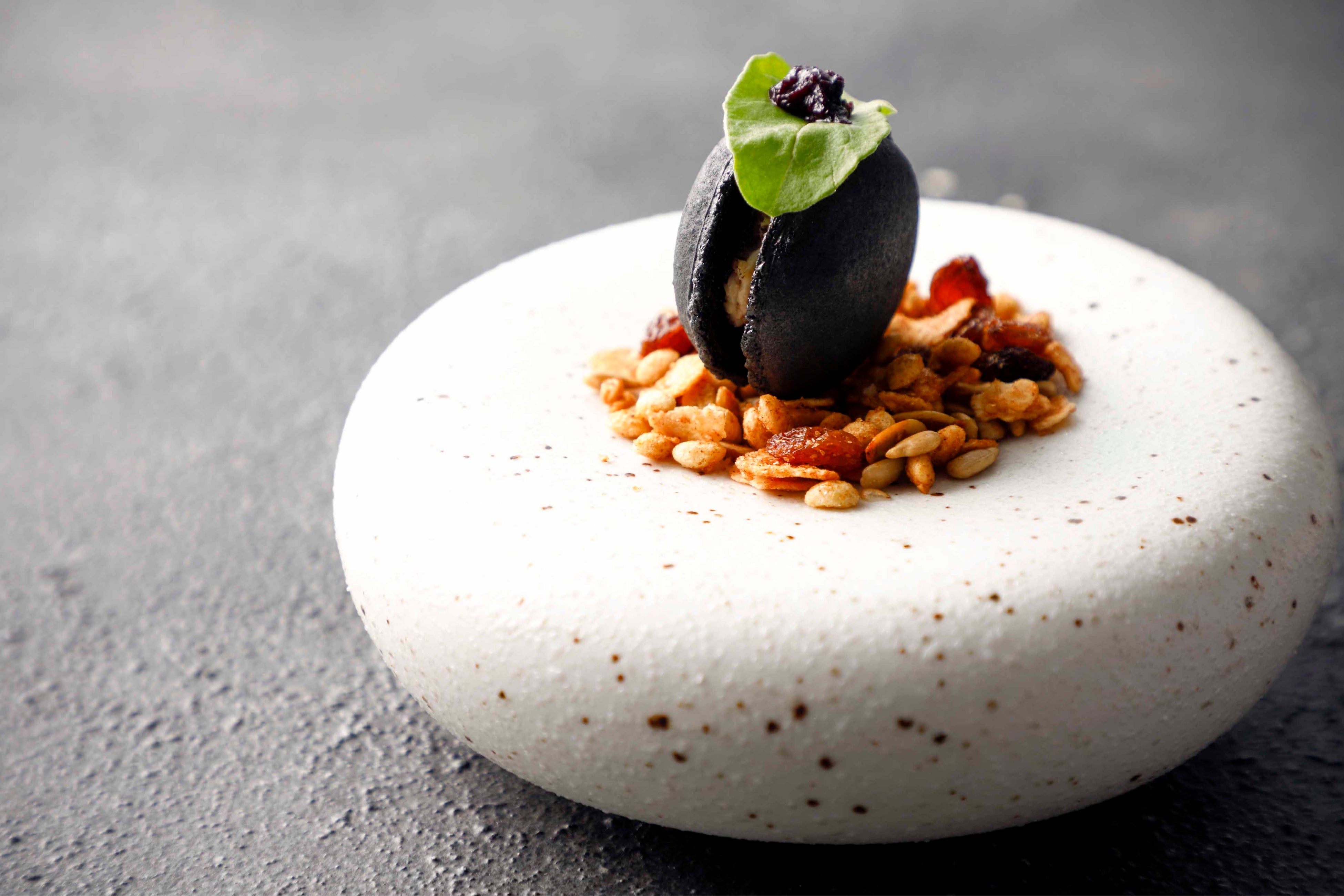 ビーツソースと柚子泡のアクセント 冬の雪見立て