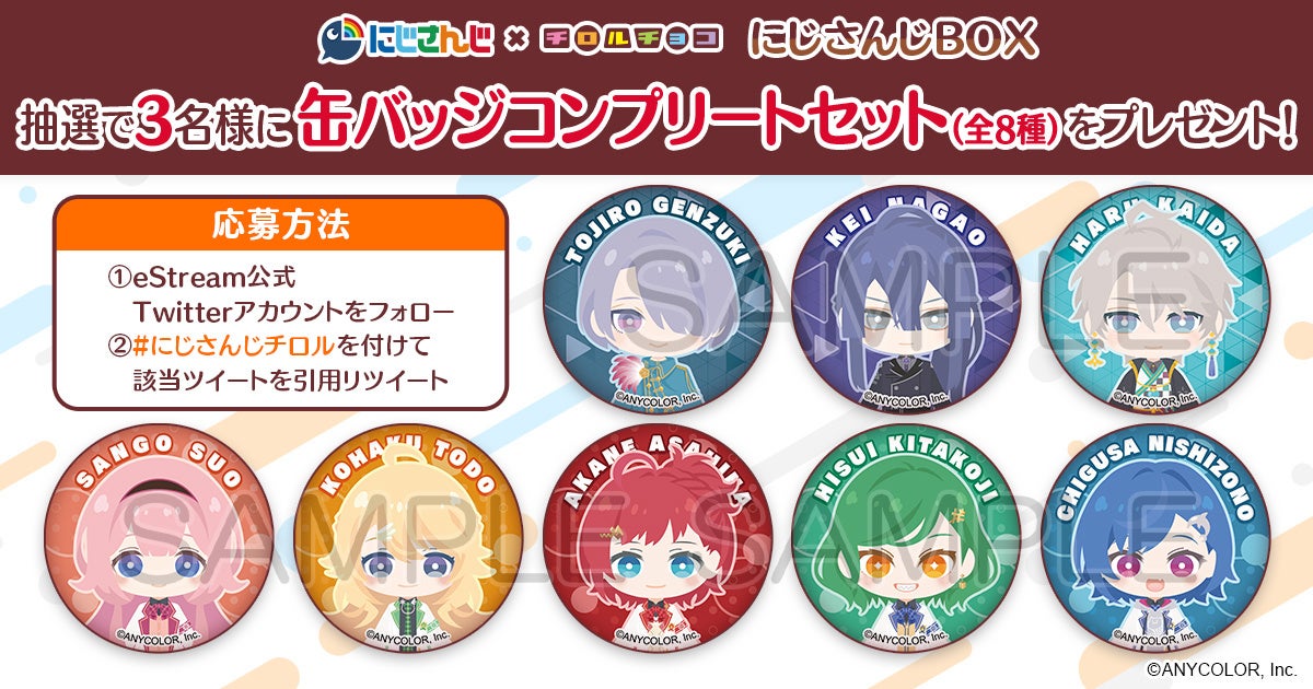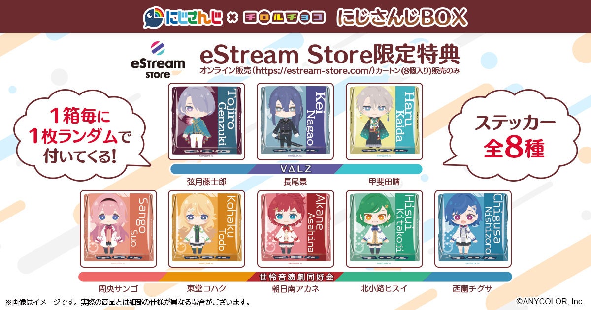 eStream、VTuber バーチャルライバーグループ「にじさんじ」より、人気VTuberのオリジナル缶バッジ付きチロルチョコ「にじさんじBOX」が12月14日に発売決定!