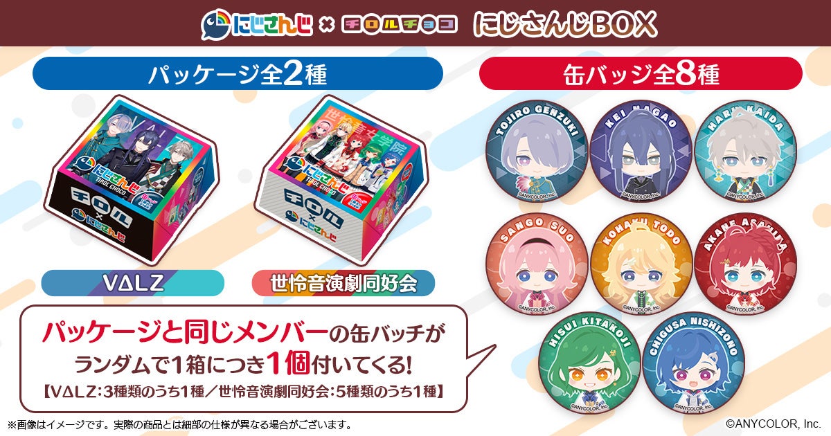 株式会社CyberZ(本社:東京都渋谷区、代表取締役社長:山内隆裕)の連結子会社、株式会社eStream(本社:東京都渋谷区、代表取締役社長:高井里菜)は、VTuber / バーチャルライバーグループ「にじさんじ」より、人気バーチャルYouTuber(以下、VTuber)全8種類のオリジナル缶バッジが内包されたチロルチョコ「にじさんじBOX」を12月14日(火)に発売することが決定いたしました。本商品は、全2種のパッケージにて、ランダムで缶バッジが1個付いてきます。無くなり次第販売終了となりますのでお早めにお買い求め下さい。