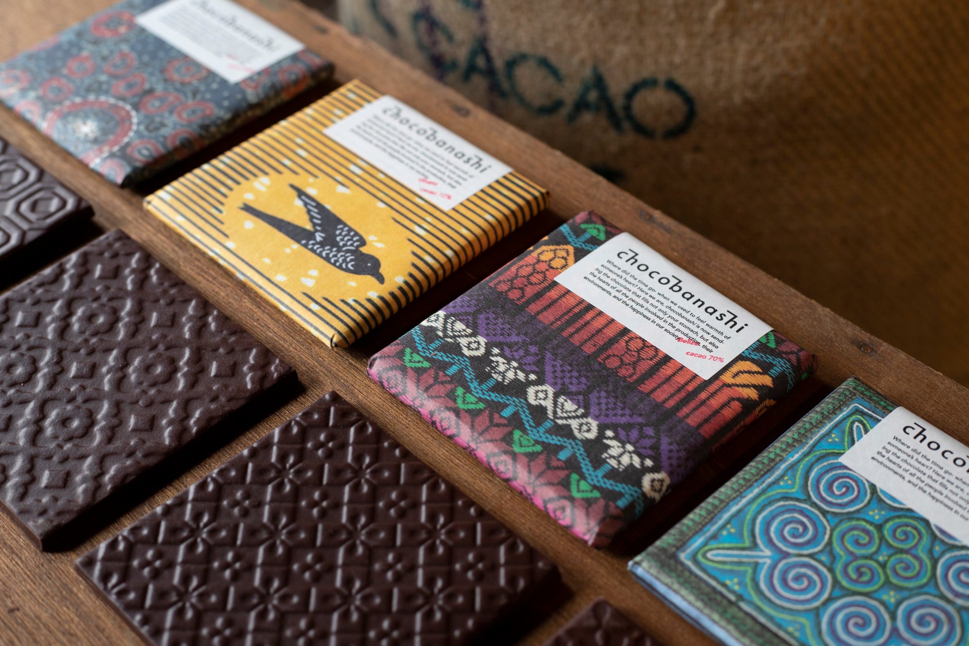 カカオ豆からチョコレートの製造、販売までを店内で行う、国内では珍しい bean to barチョコレート (クラフトチョコレートの一種) の専門店のchocobanashi。途上国 (インドなど)の小規模農園から直接カカオ豆を買い付けることで、現地農家に適正な価格を支払うフェアトレードを実現しています。