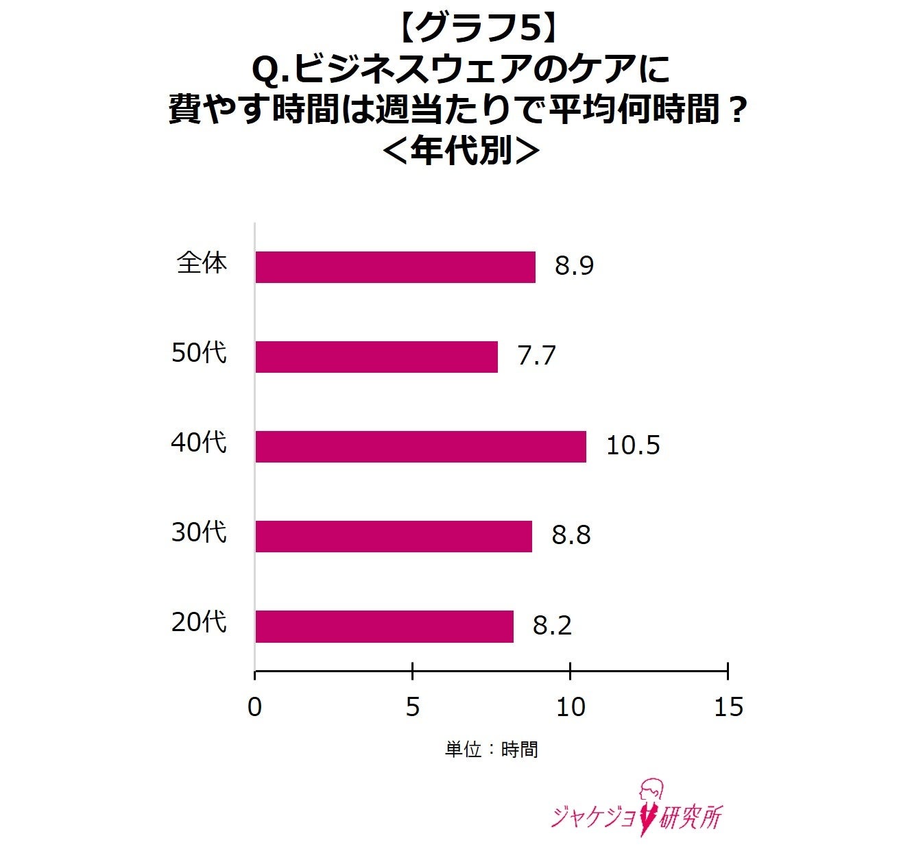 年代別では、20代が「平均8.2時間」、30代が「平均8.8時間」、40代が「平均10.5時間」と、年代が上がるにつれてケアに費やす時間が増加する傾向が見られます(グラフ5)。