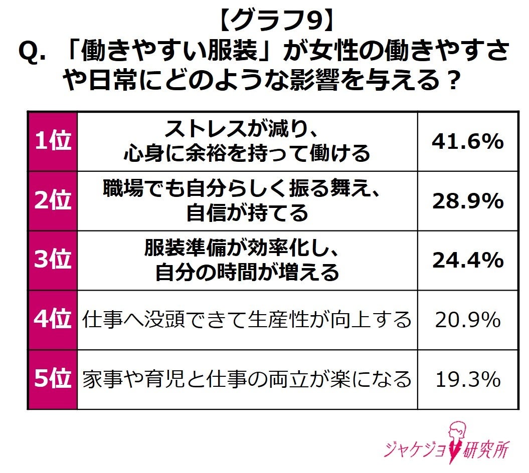 「働きやすい服装」が女性の働きやすさや日常に与える影響として、1位は「ストレスが減り、心身に余裕を持って働ける」、2位「職場でも自分らしく振る舞え、自信が持てる」、3位「服装準備が効率化し、自分の時間が増える」という結果が得られました(グラフ9)。