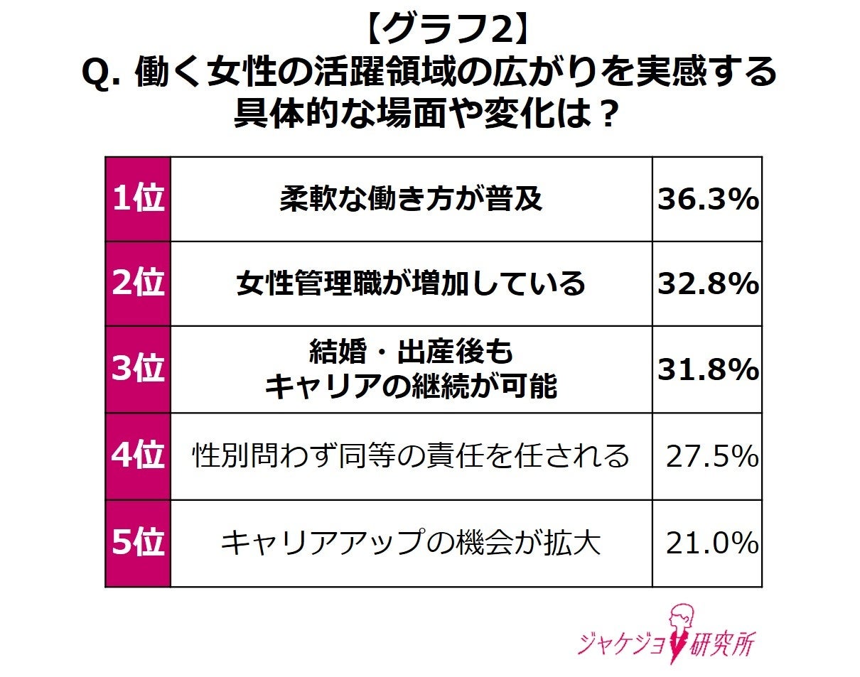 また、柔軟な働き方の普及が、女性のキャリア形成や活躍の場を広げるきっかけになっていることもわかりました。「柔軟な働き方が普及(36.3%)」が最も多くの支持を集めたほか、「女性管理職の増加(32.8%)」や「結婚・出産後もキャリアの継続が可能(31.8%)」といった変化が挙げられています(グラフ2)。