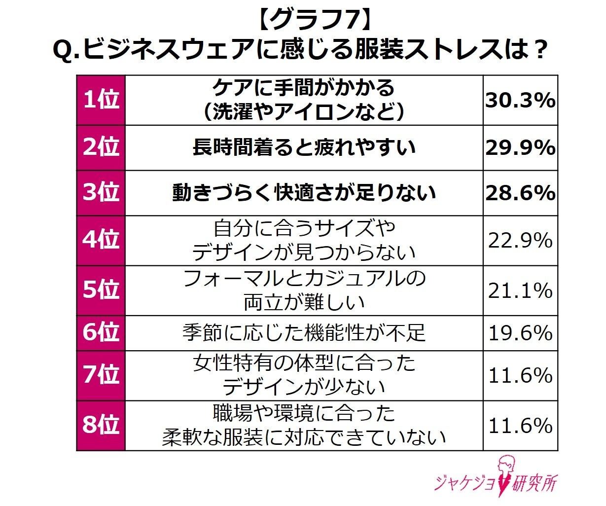 働く女性が抱えるビジネスウェアの主なストレスとして、1位「ケアに手間がかかる(30.3%)」、2位「長時間着ると疲れやすい(29.9%)」、3位「動きづらく快適さが足りない(28.6%)」が挙げられました(グラフ7)。ライフスタイルや働き方が多様化する中で、ビジネスウェアに対する進化を求める声は高まっています。