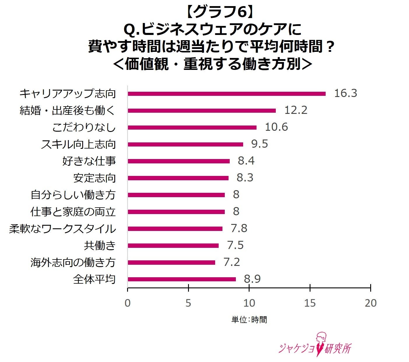 また、「重視する働き方の価値観」別に調査したところ、最もケアに時間をかけているのは、キャリアアップを目指す女性で「平均16.3時間」、次いで、結婚・出産後も仕事を継続する女性が「平均12.2時間」という結果になりました(グラフ6)。