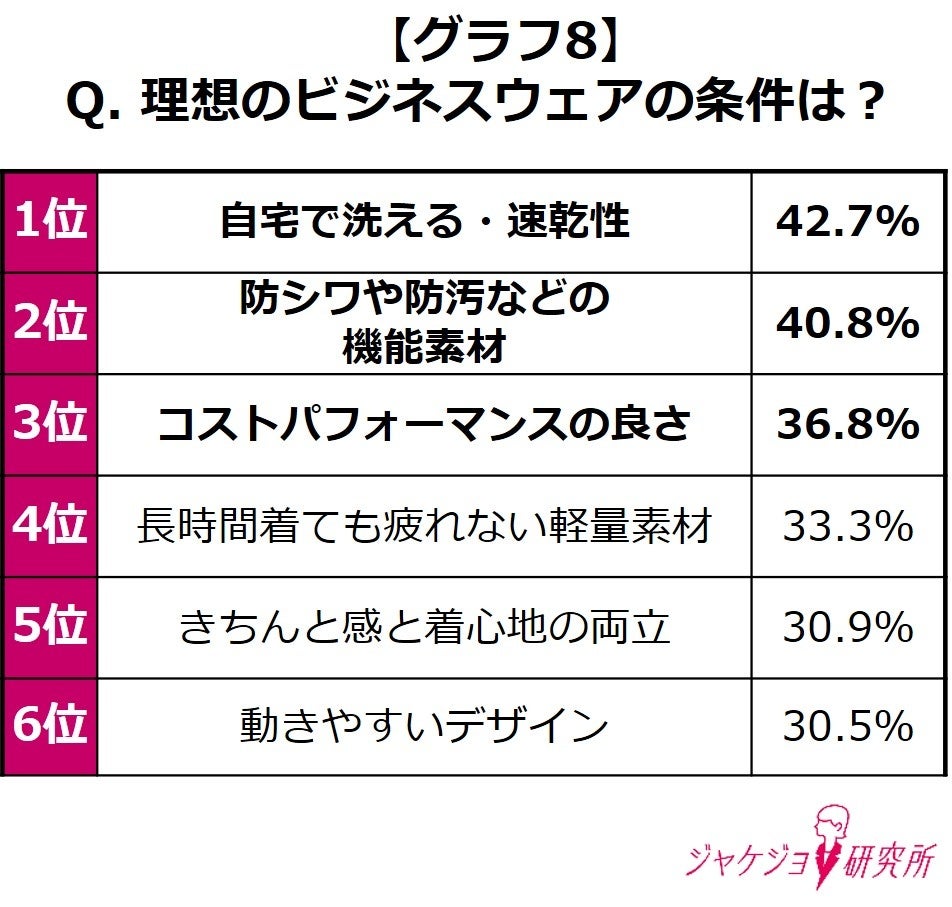 調査によると、理想のビジネスウェアに求める機能として、1位は「自宅で洗える・速乾性(42.7%)」、2位は「防シワや防汚などの機能素材(40.8%)」が挙げられました(グラフ8)。これらの