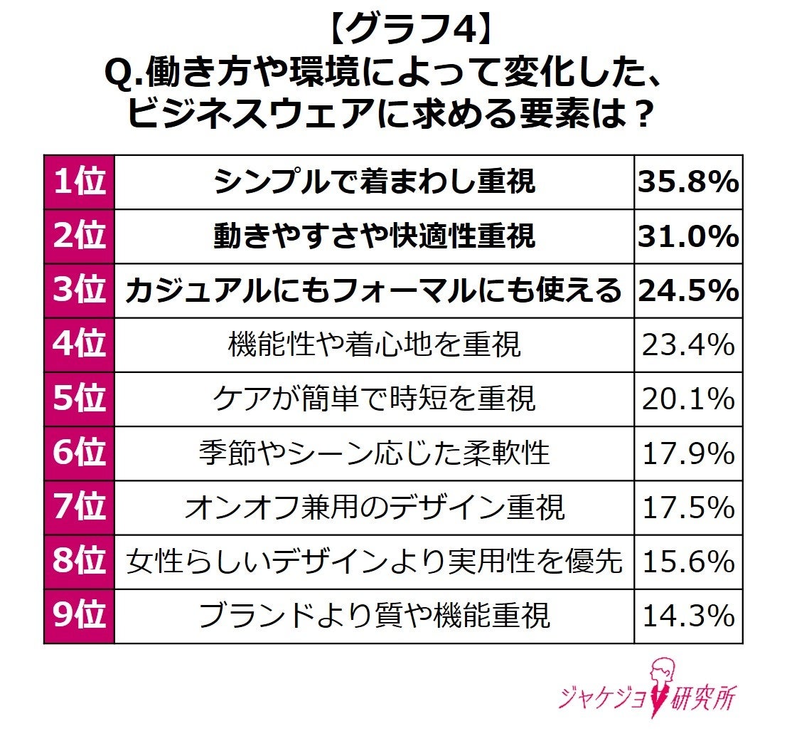 約78%の働く女性が、ライフスタイルの多様化に伴い、ビジネスウェアの変化を感じていると回答しました(グラフ3)。働き方や環境の変化を背景に、ビジネスウェアにおいて求める要素として、1位「シンプルで着まわし重視(35.8%)」、2位「動きやすさや快適性重視(31.0%)」、3位「カジュアルにもフォーマルにも使える(24.5%)」という結果に(グラフ4)。