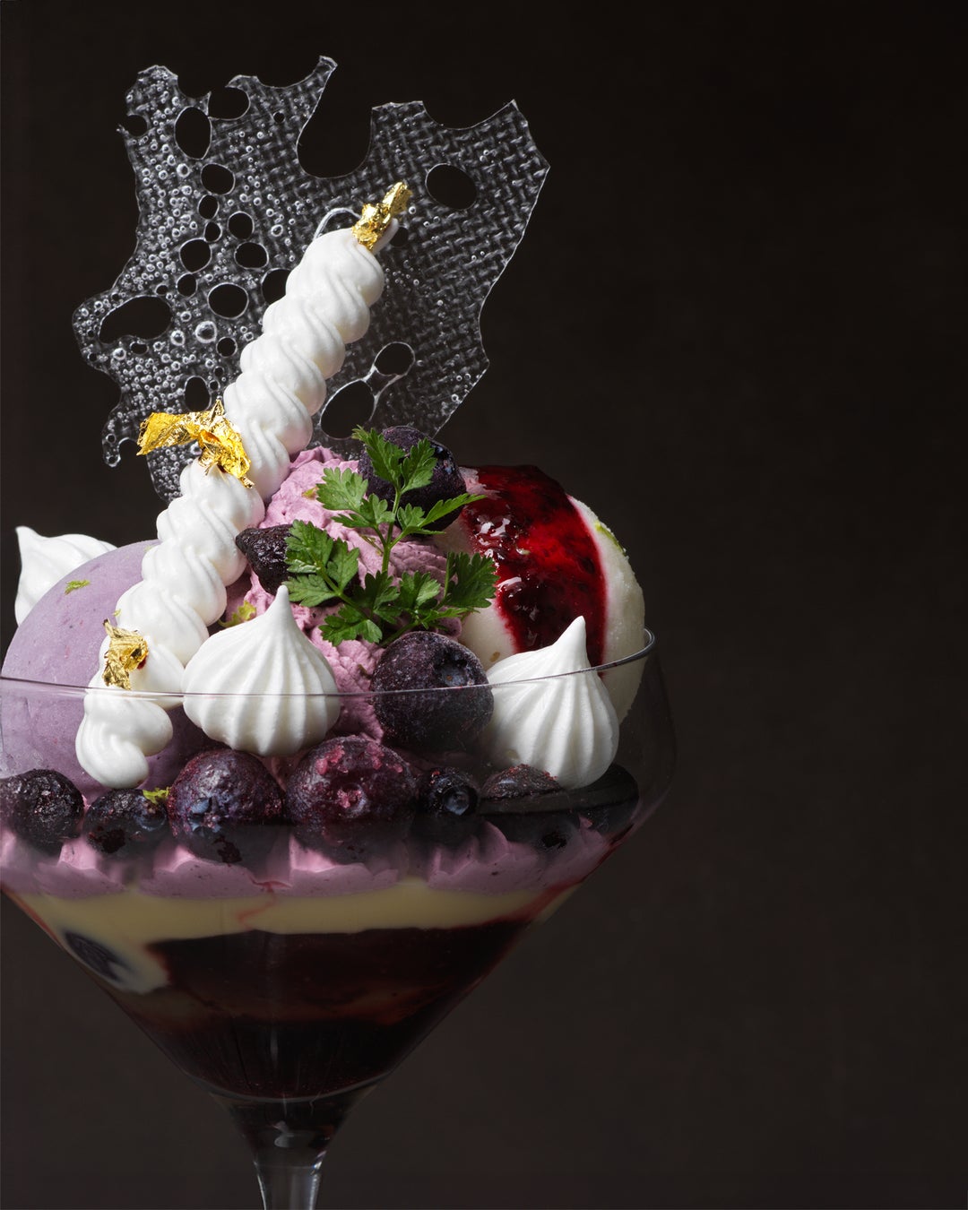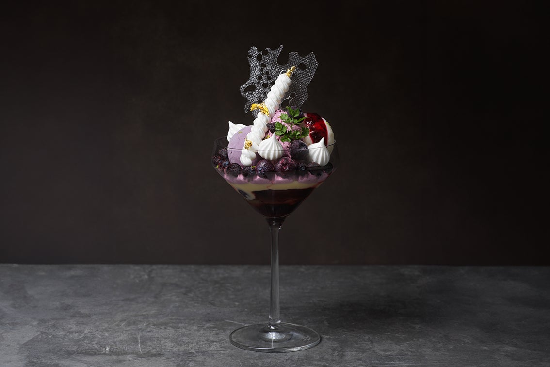 ブルーベリーの風味がふんわりと広がる「グラスミルティーユ」と、ミルキーな味わいの「特製グラスジャージー」の2種類のアイスを中心に構成。ライムのゼストを添えることで、清々しい香りのアクセントを加えています。