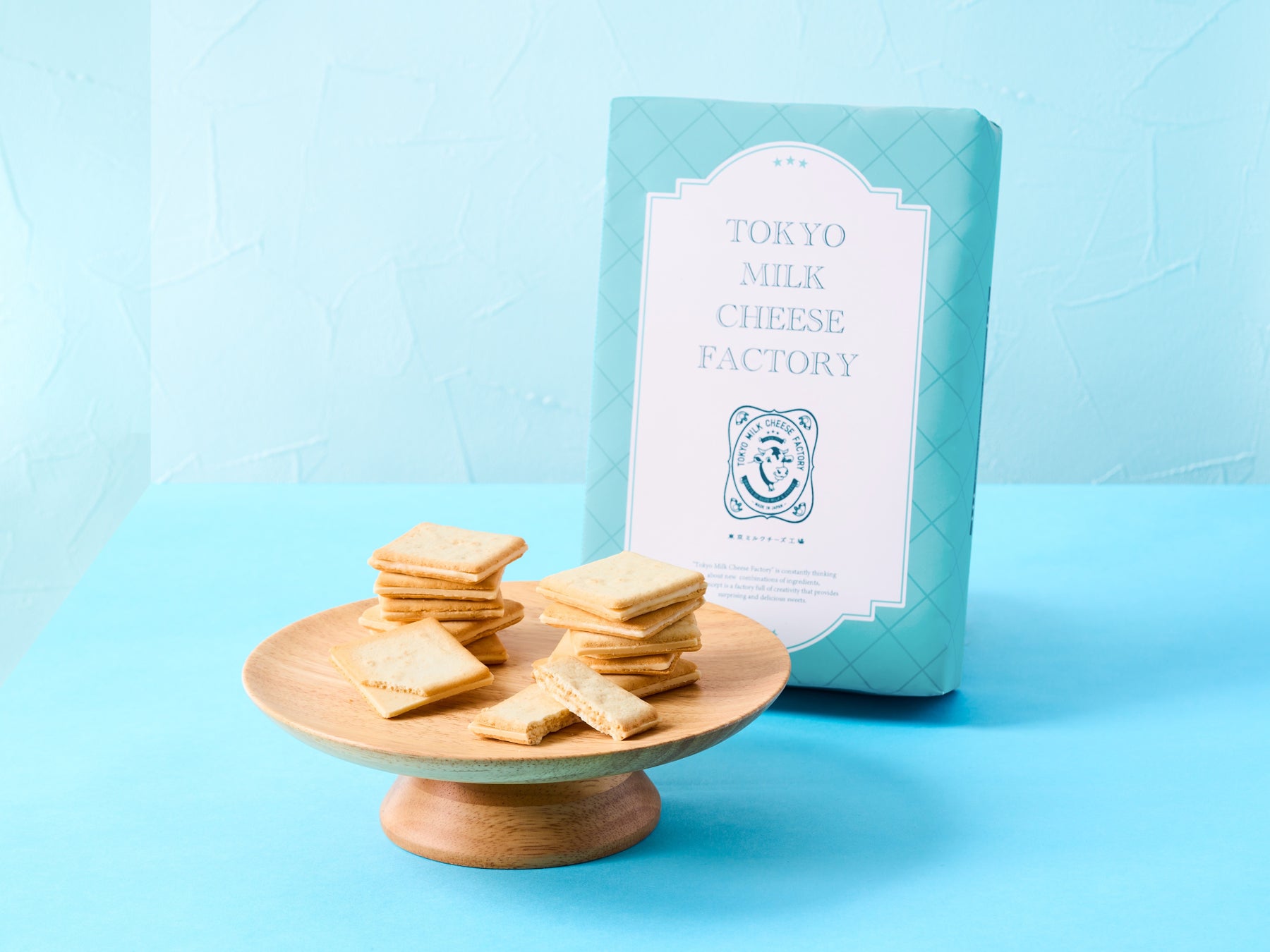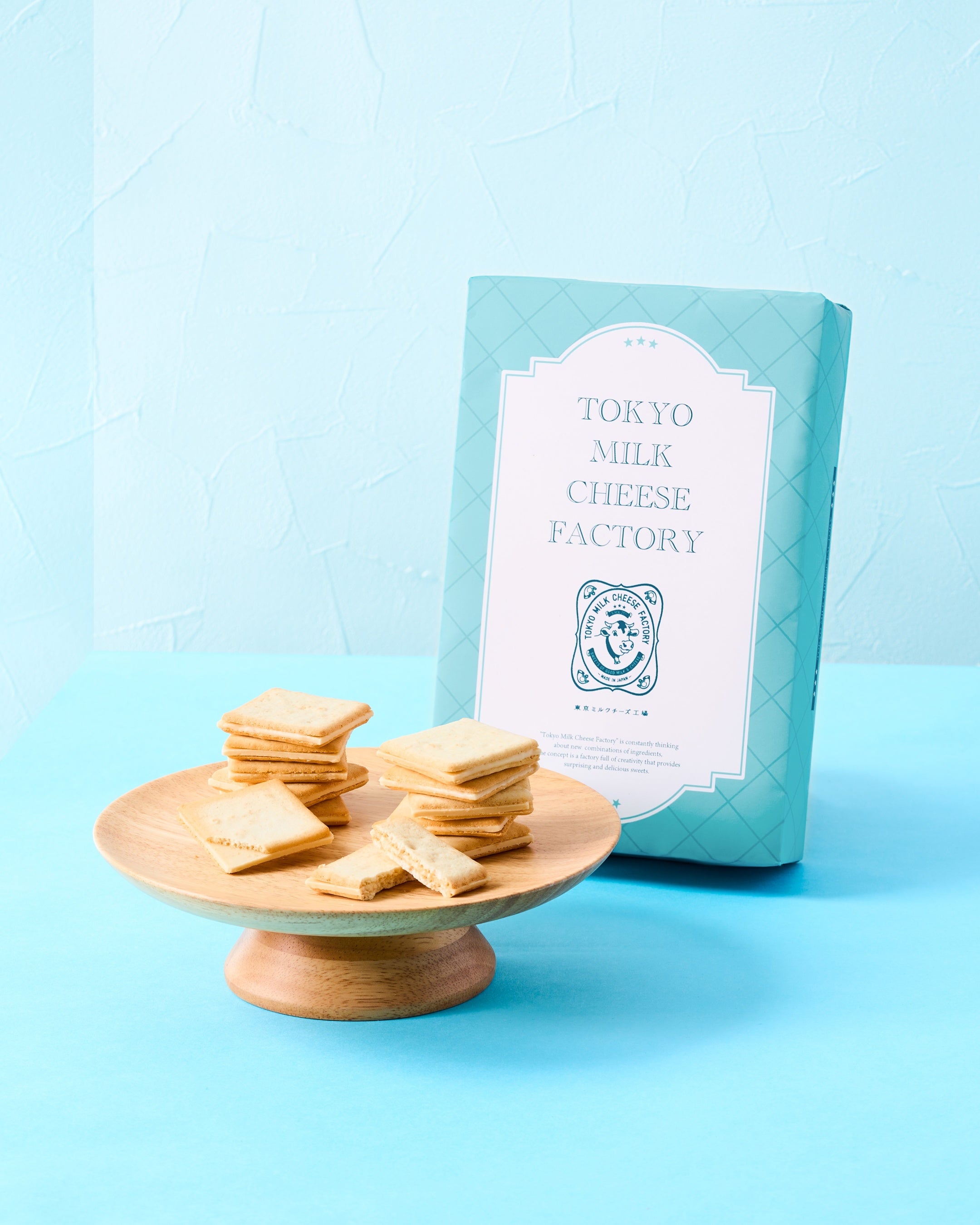 【東京ミルクチーズ工場】の代表作「ソルト&カマンベールクッキー」と「蜂蜜&ゴルゴンゾーラクッキー」の2種類を詰合わせ、目を惹く鮮やかで上品なブルーグリーンが印象的なオリジナルデザインのパッケージでお包みしました。