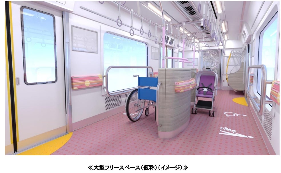子育て世代やシニア世代など、年齢や性別、また目的を問わず、あらゆるお客さまが安全・快適に鉄道をご利用いただけるよう、当社初となる大型フリースペース(仮称)を導入します。座席を廃止することでベビーカーや車いすの方にとって利用しやすいエリアとし、加えて、お子さまが夢中になれるような大型窓を設置します。設置号車は車両乗降時にエレベータに近い5号車とします。
