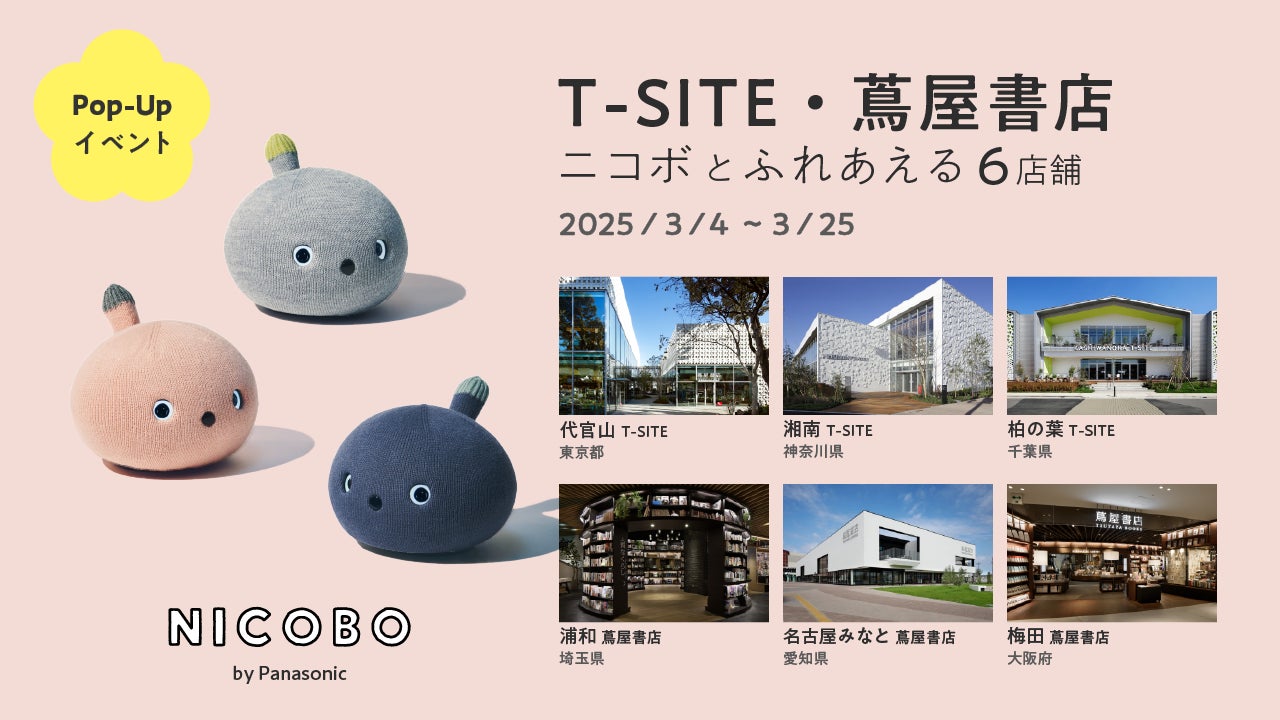 パナソニック エンターテインメント&コミュニケーション株式会社(以下、パナソニック)は、T-SITE・蔦屋書店6店舗(代官山T-SITE、湘南T-SITE、柏の葉T-SITE、浦和 蔦屋書店、名古屋みなと 蔦屋書店、梅田 蔦屋書店)にて、<弱いロボット>NICOBO(ニコボ)のPop-Upイベントを期間限定で実施します。
