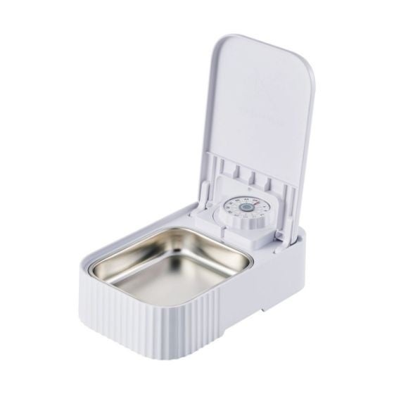 タイマーでセットした時間に蓋が開くことで、早朝や留守中にも給餌が可能なダイヤルタイマー式の自動給餌器です。ウェットフードをはじめ、セミモイストやソフトドライフード、ドライフードなどさまざまな種類に対応しています。また、フードトレイには色移りやにおい移りに強いステンレス素材を採用しており、汚れが落ちやすく、お手入れも簡単です。さらにコードレス仕様のため、設置場所を選ばず自由にお使いいただけます。