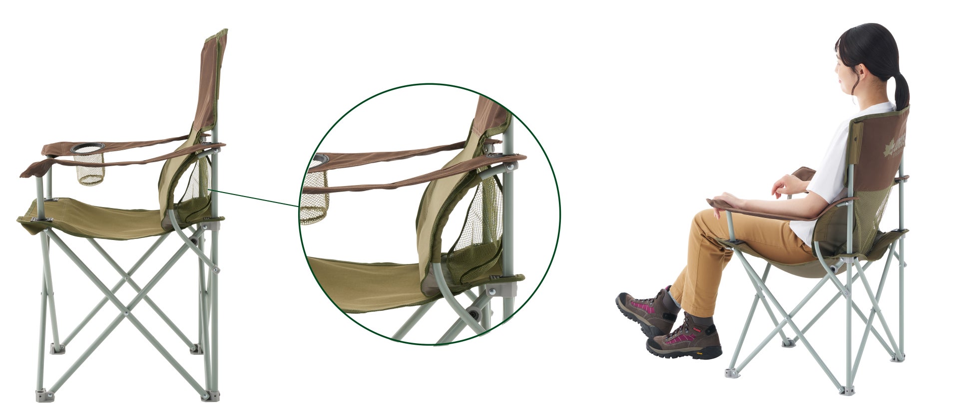 座面高は43cmと立ち座りがしやすい高さに設定しており、ダイニングテーブルにも相性抜群です。キャンプやBBQはもちろん、自宅での作業や急な来客時のサブチェアとしても幅広く活躍します。さらに、耐荷重は約120kgと安心して使用できる強度を備えています。背面には左右どちらからでもアクセスできるメッシュポケット付きで、スマホや冊子、小物類の収納に便利です。アーム部分には便利なドリンクホルダーも付属しています。