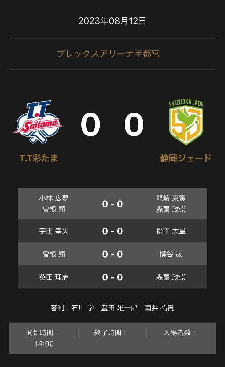 ノジマTリーグ2023-2024シーズン公式戦 8月12日(土)14:00試合開始 T.T彩たま vs 静岡ジェード 対戦オーダー発表