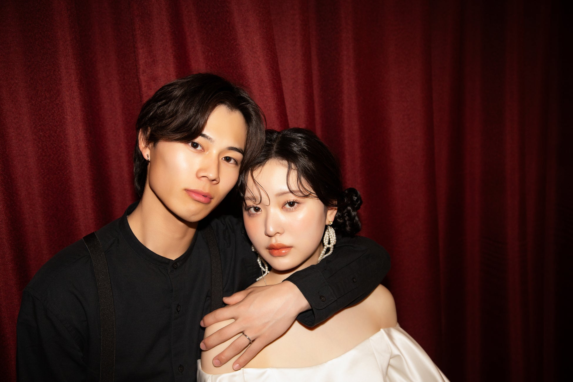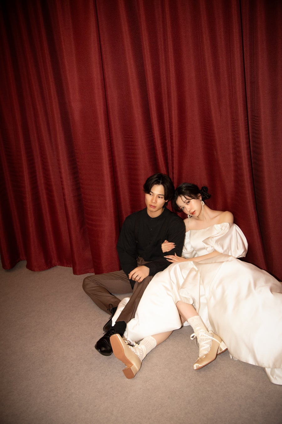 情熱と上品さを表現する赤色のカーテンはアンティークなスタイルに大人感を演出。フラッシュを焚いたようなレトロ感がパールやリボンの艶めきと融合しアンティークな質感を底上げする。