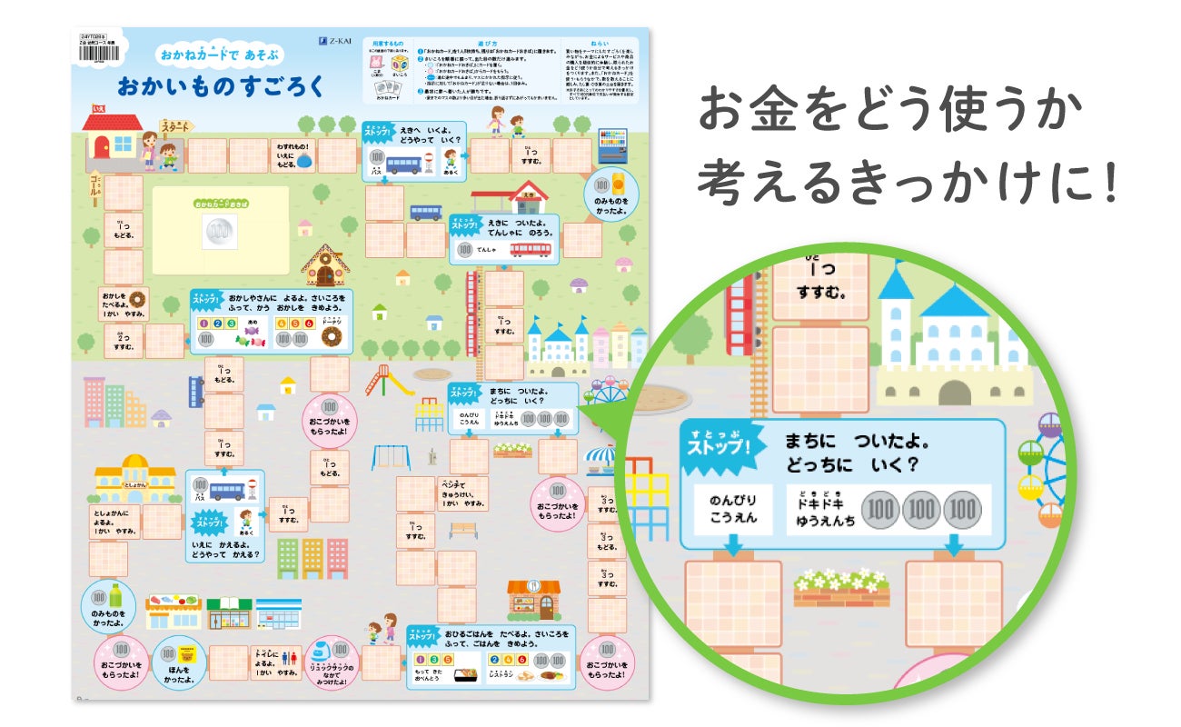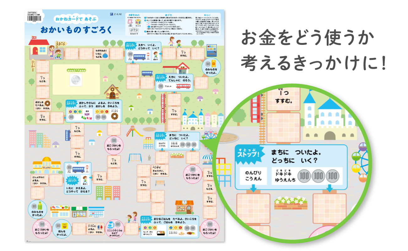 買い物をテーマにしたすごろく。疑似的なお金を使って、さまざまサービス提供を受けたり商品購入しながらゴールを目指し、まちの施設とその役割・特徴を理解することができます。選択によってお金の使い方が変わるため、ゲームをとおして限られたお金をどう使うかを考えるきっかけを作ります。