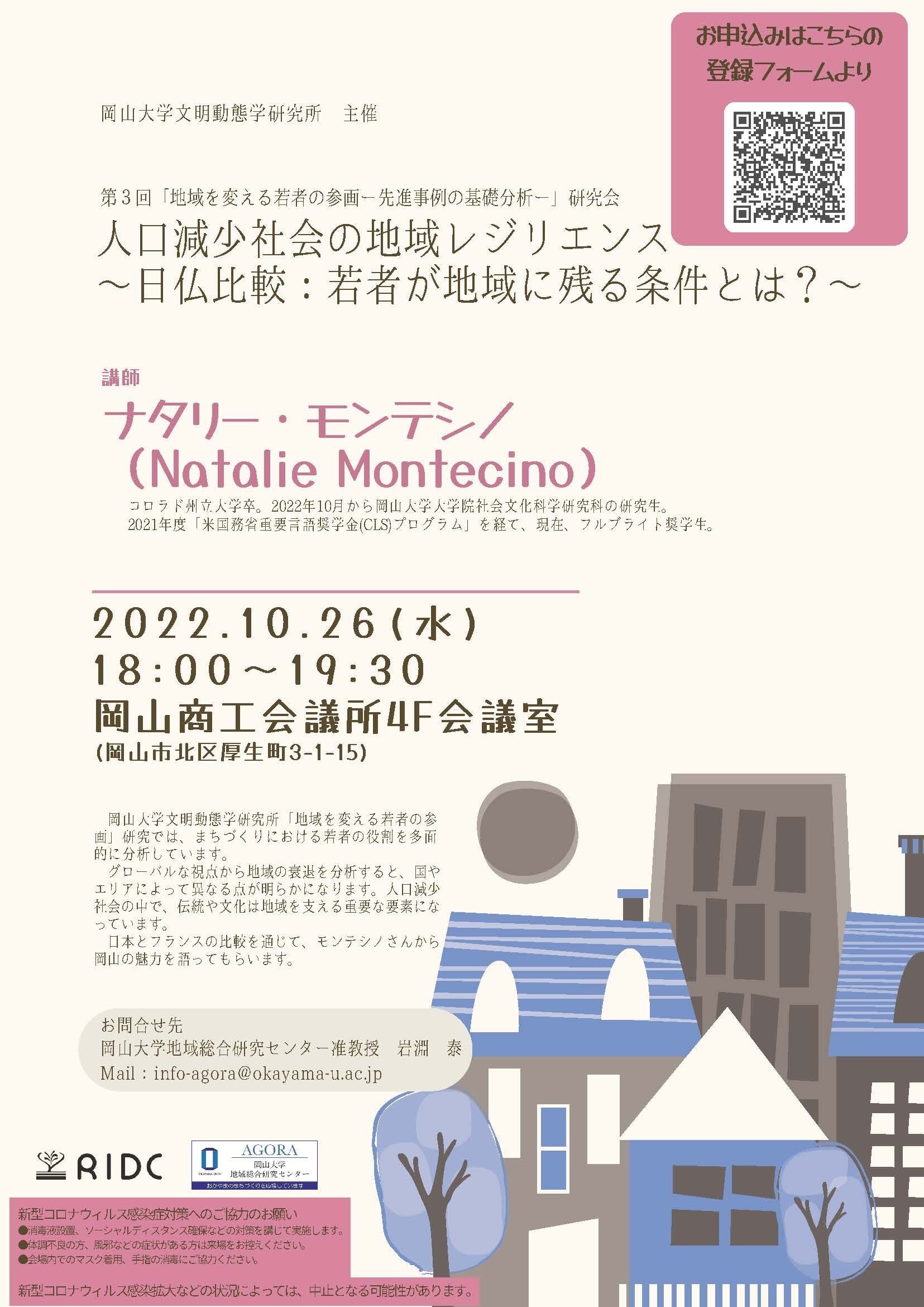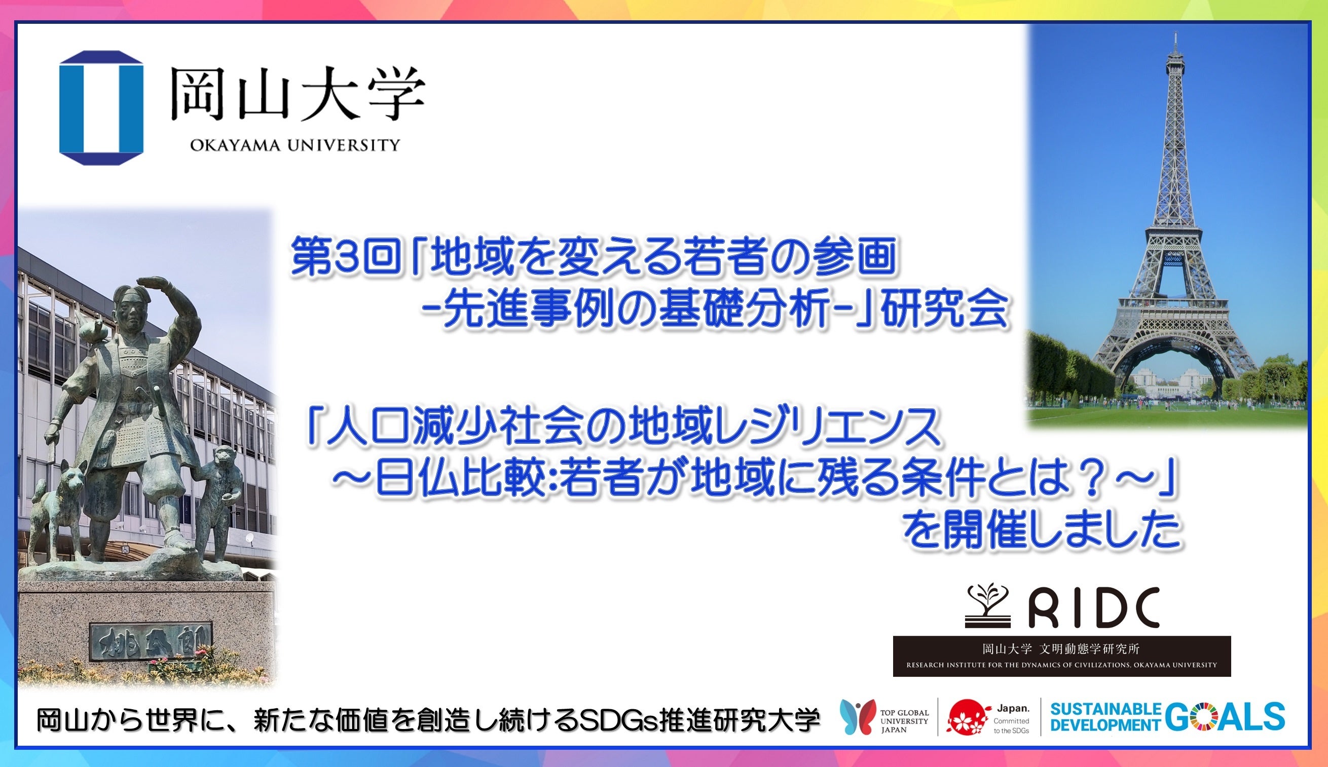 【岡山大学】第3回「地域を変える若者の参画-先進事例の基礎分析-」研究会「人口減少社会の地域レジリエンス ~日仏比較:若者が地域に残る条件とは?~」を開催しました