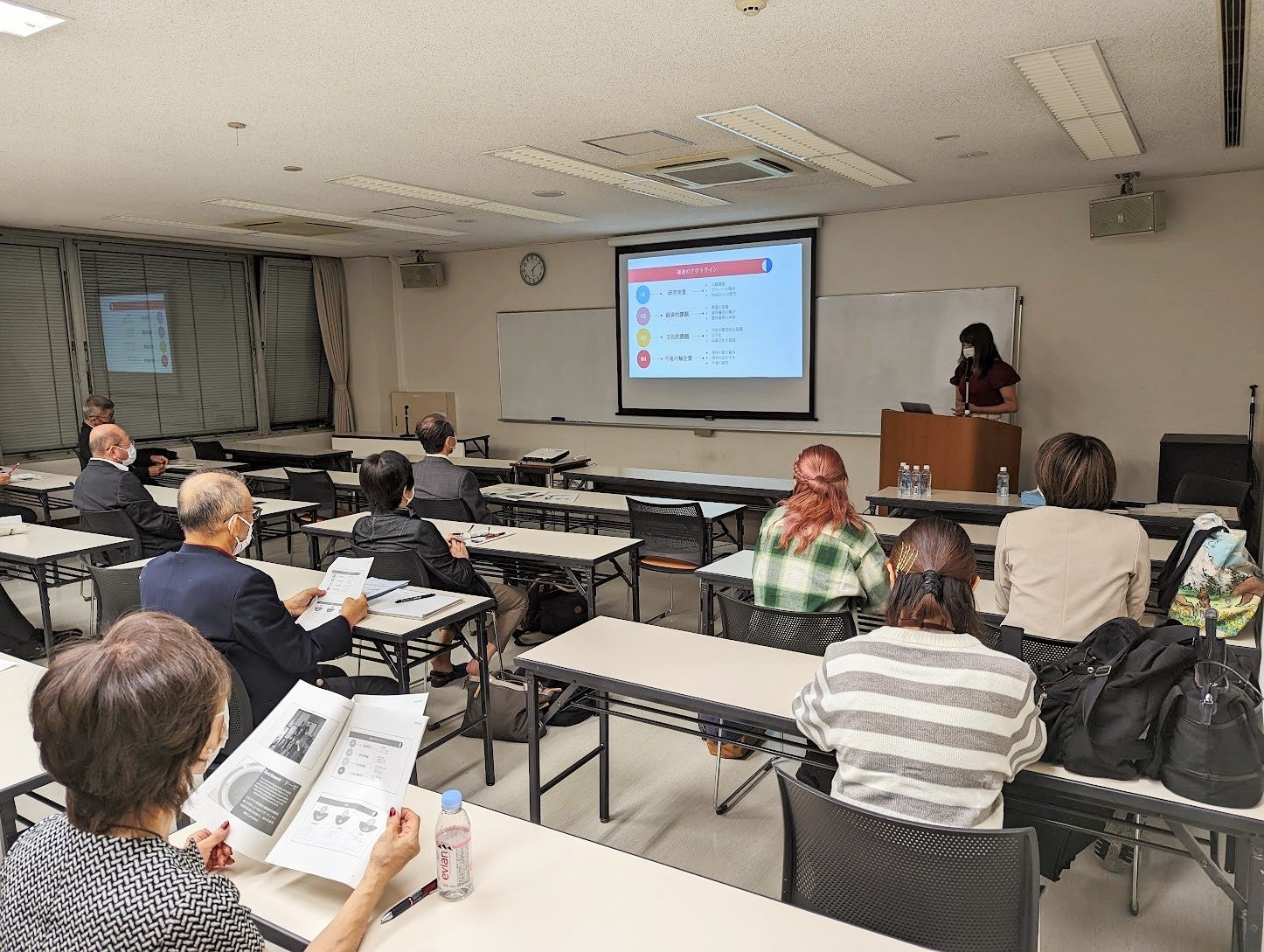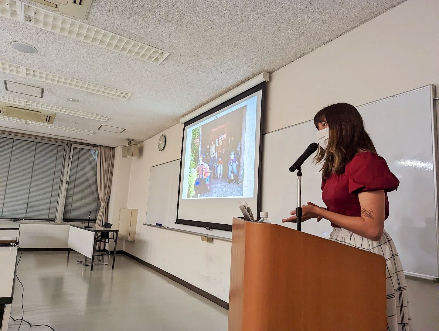 講師は、2021年度「米国務省重要言語奨学金(CLS)プログラム」を経て、現在フルブライト奨学生として岡山大学社会文化科学研究科で学ぶナタリー・モンテシノ氏です。モンテシノ氏は、「人口減少社会の地域レジリエンス ~日仏比較:若者が地域に残る条件とは?~」を発表し、持続的な地域社会を分析するにあたり、地域のアイデンティティを基盤としたモデルが岡山県各地に存在すると指摘しました。日本やフランス、そして、アメリカにおいても、人口減少は世界的な課題となっており、その対応策は各地で異なっているそうです。
