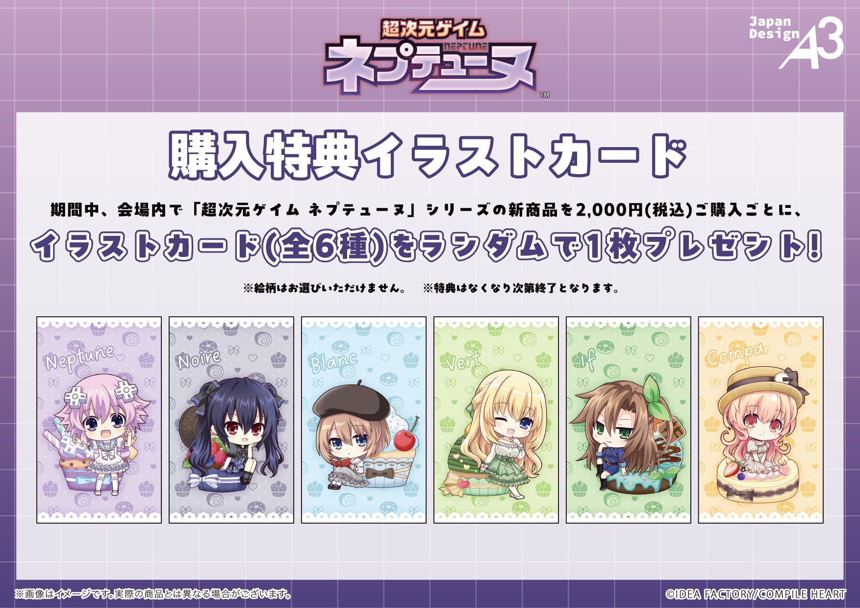 会場や通販で「超次元ゲイム ネプテューヌ」シリーズ新商品を2,200円(税込)お買い上げごとに、ミニキャラを使用した特典イラストカード(全6種)をランダムで1枚プレゼントいたします。通販も対象となりますので是非ご利用ください!