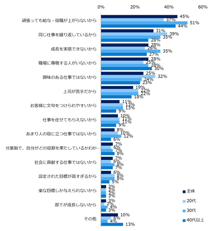 ★ 仕事でやりがいを感じられない理由、上位は「頑張っても給与・役職が上がらないから」「同じ仕事を繰り返しているから」。