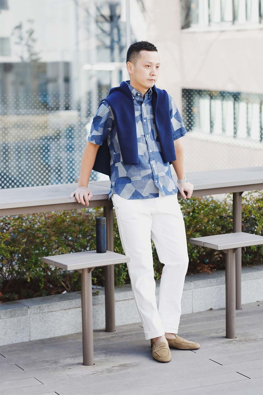 デザイン性がありながらブルートーンで統一した柄はシンプルなボトムと合わせたコーディネートがシャツのデザインを引き立たせてくれます。素材には、ソフトな風合いが心地よいコットン100%生地を使用。快適な着心地で夏に重宝するアイテムです。
