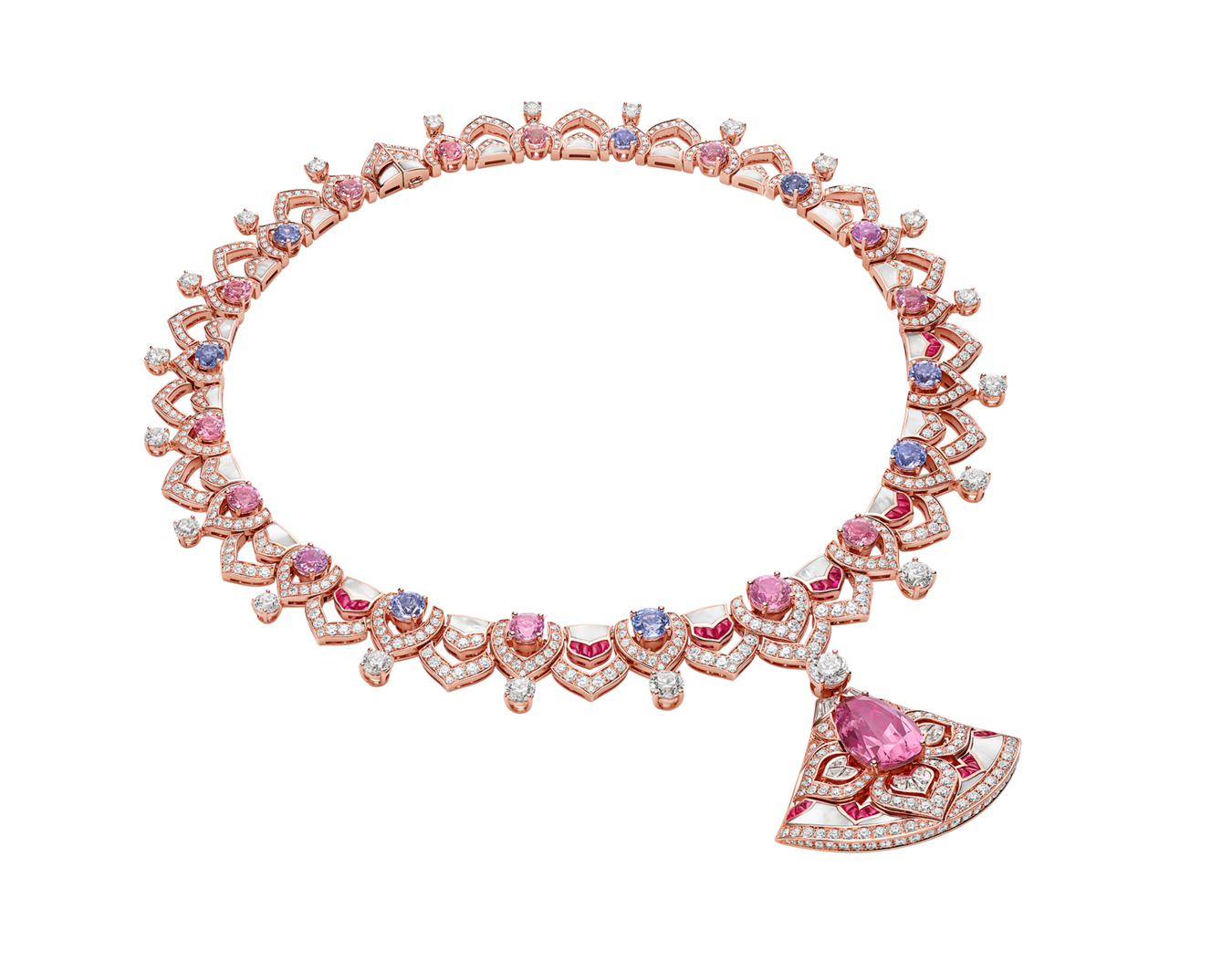 その中でも、ラウンドファンシーシェイプのスピネル21石(計17.13カラット)をあしらった18Kのピンクゴールド製のネックレス「ディーヴァ ドリーム」は、まさに現代の女性らしさを表現しています。彩り豊かなピンクの官能的なコンビネーションがルビーのプレシャスな雰囲気によってさらに引き立ち、人目を惹きつけるペアシェイプのスピネル(11.93カラット)をダイヤモンドの花びらと精緻なジェムストーンで縁取られ、至極の高みへと押し上げられます。