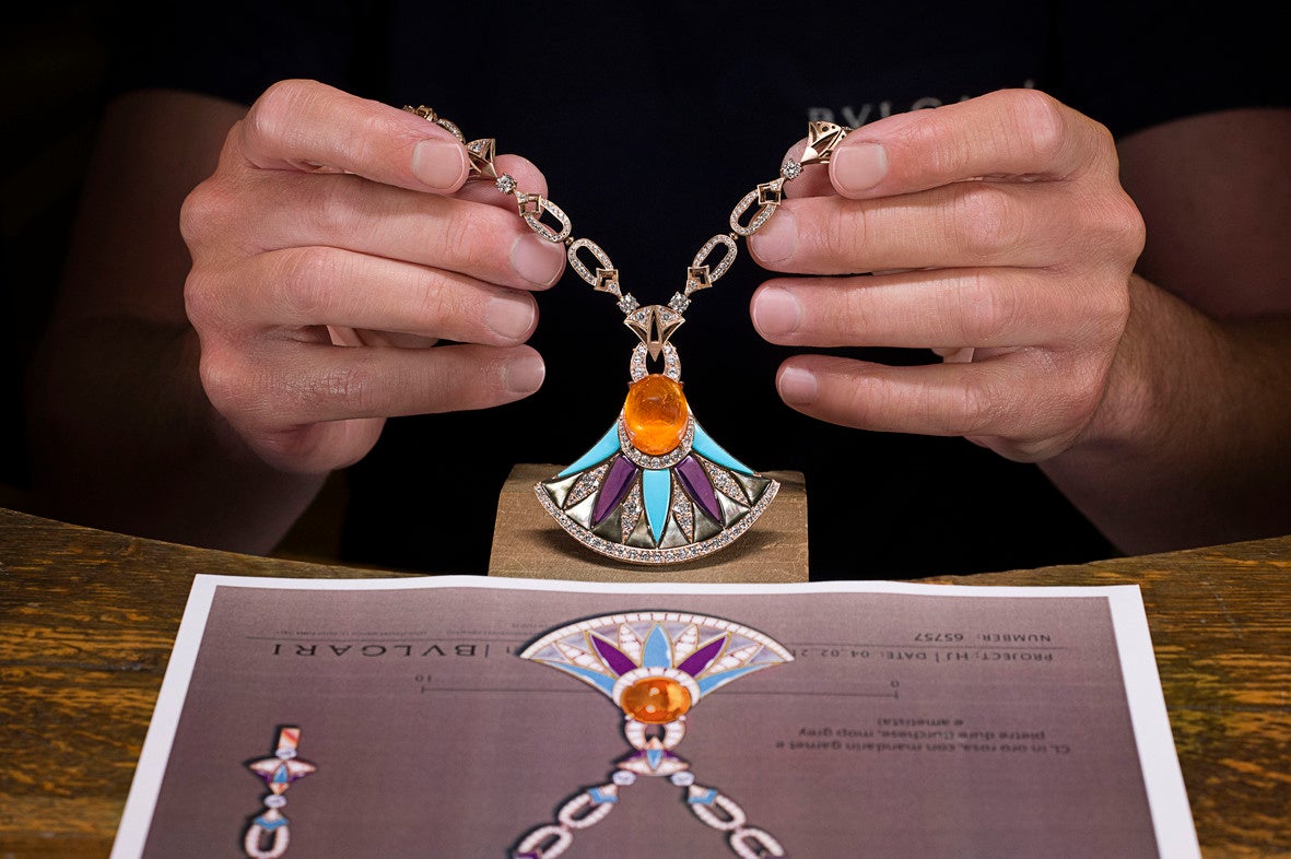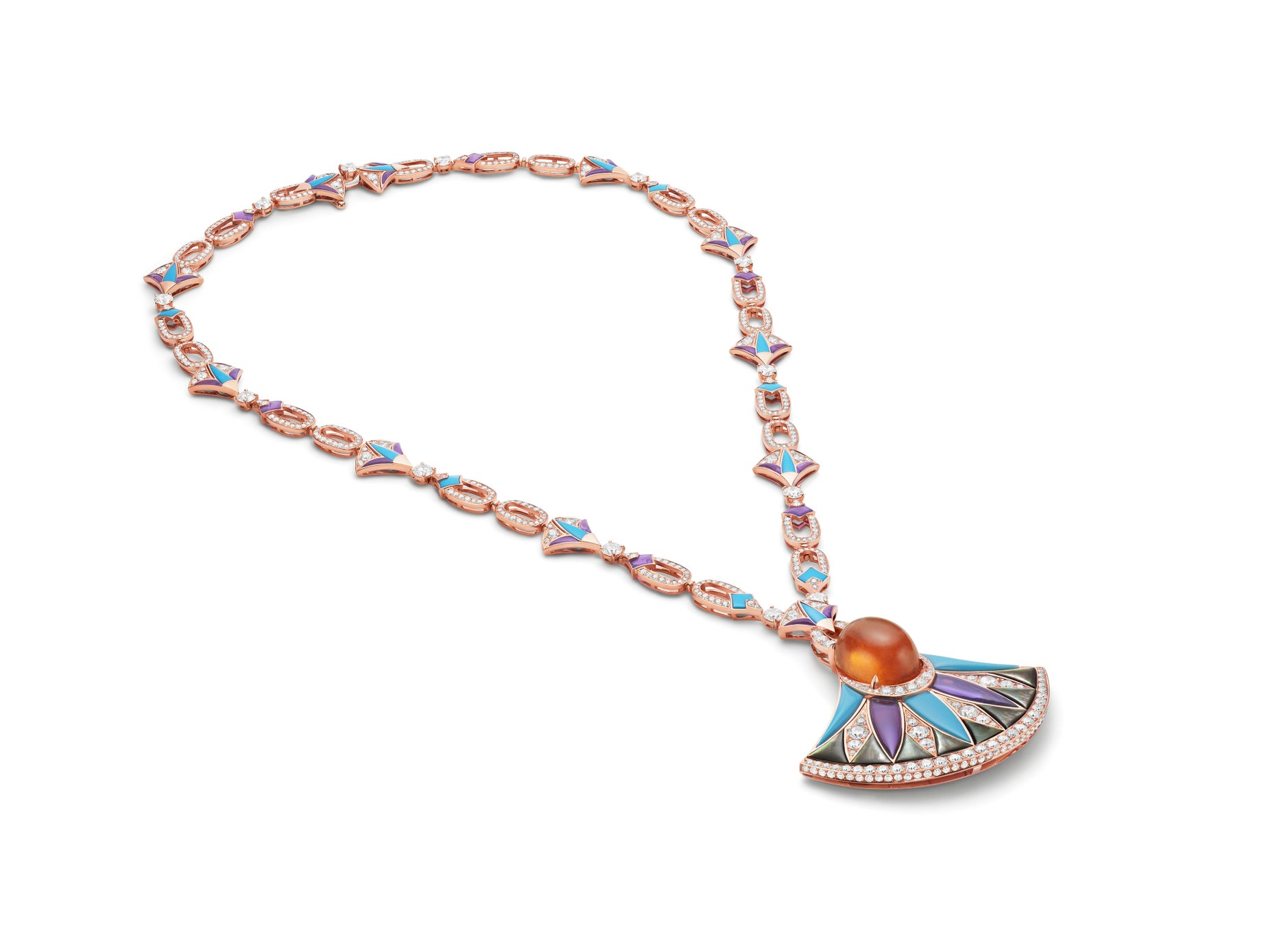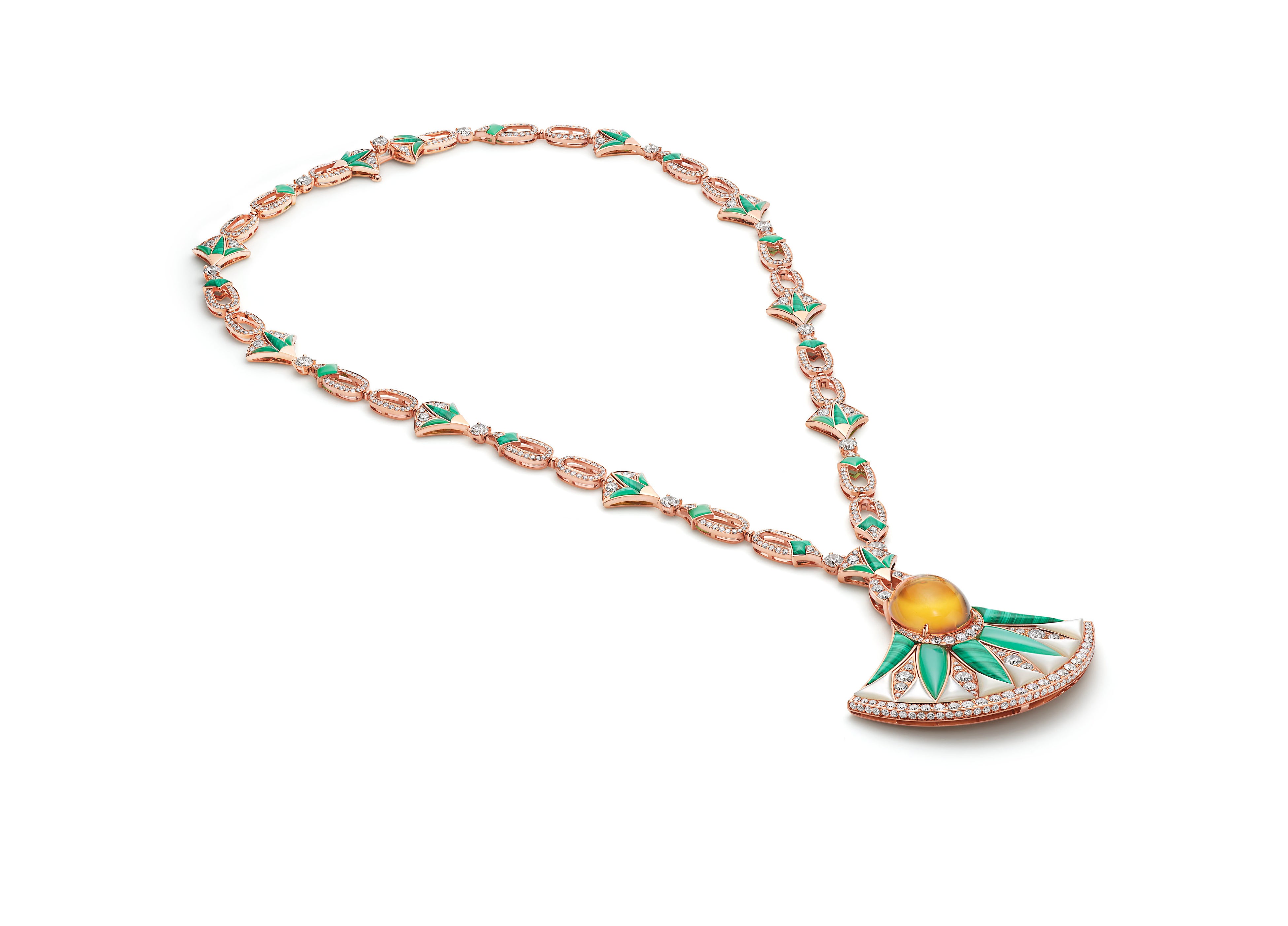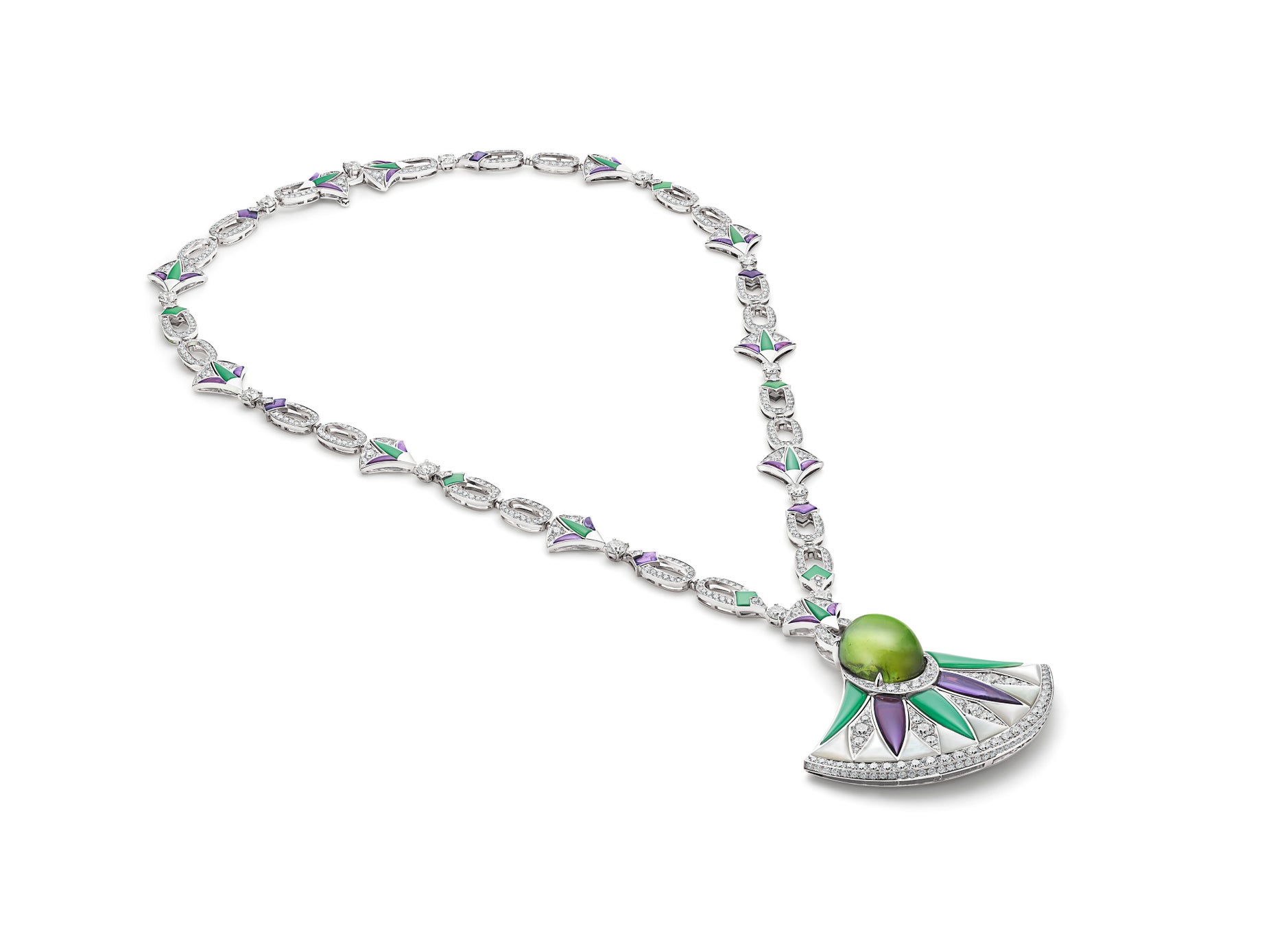 クリエイションは、ハイジュエリーにおける自然界の最も美しいジェムストーンが持つ刺激的なニュアンスや豊かな質感、魅惑的な情感に命を吹き込みます。ネックレスの複雑なデザインに合わせて巧みにカットされ、セッティングされたジェムストーンの一つ一つがローマの伝統に深く根ざした格調高いマルケトリ技法を用いて美しく配されています。
