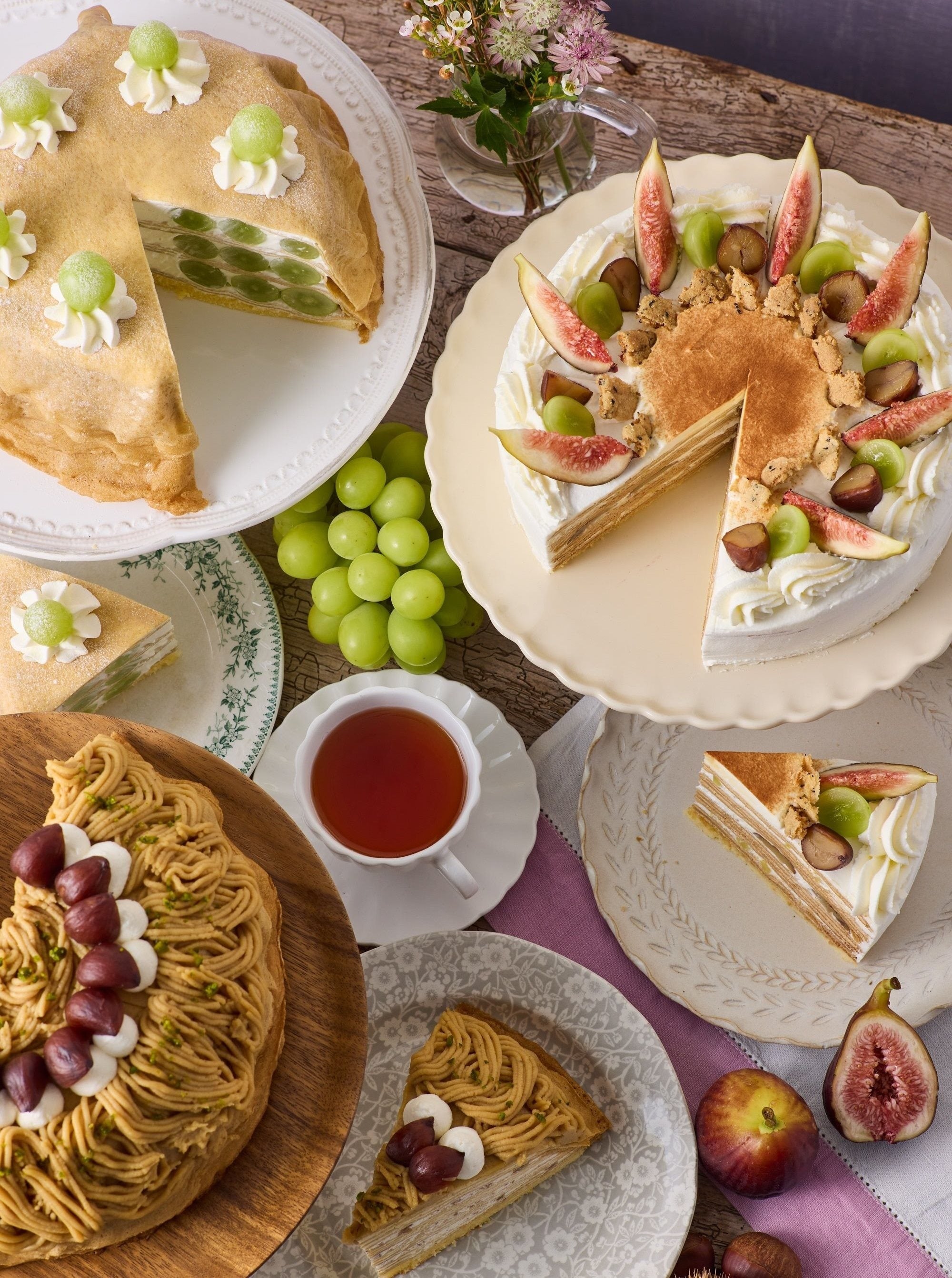 アフタヌーンティー・ラブアンドテーブルに栗とシャインマスカットの秋限定ミルクレープが登場します。紅茶が香るミルクティーホイップとほっくりと甘い栗をあわせ、シャインマスカット、いちじく、栗をトッピングした「マロンミルクティーのミルクレープ」と、ラム酒入りの濃厚なマロンクリームやコクのあるディプロマットクリーム、細かく刻んだ栗を重ねた「マロンのミルクレープ」、爽やかな甘さとパリッとした食感が魅力のシャインマスカットを贅沢に使った「シャインマスカットのミルクレープ」の3種を提案します。