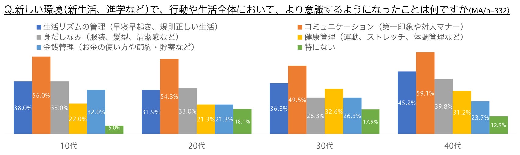■新生活において行動や生活面で意識するようになったことの1位は、全年代共通で「コミュニケーション(第一印象やマナー)」」