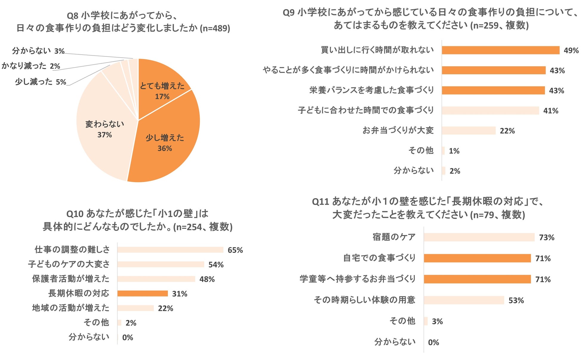 <調査サマリー> ー全国の20~50代の男女8801名に「小1の壁」の認知度を調査 ●「小1の壁」という言葉を知っていたのはわずか37%のみ(Q1)。子どもが小学校にあがることによる親の負担の変化を聞いたところ、30%が「増える」と回答した一方で19%は「減る」と回答(Q2)。 ー現在小学生の子供を持つ共働きの男女489名に「小1の壁」の実態を調査 ●52%が小学校入学後に「小1の壁」を感じたと回答(Q3)。 ●小学校入学以降の変化について聞いたところ、57%が小学校入学以降負担が増えたと回答(Q4)。また、61%が小学校にあがってから「時間が足りない」と感じることが増えたと回答し(Q5)、47%が職場や周囲の理解やサポートを得づらいと感じると回答(Q6)。 ●56%が出社回帰で「小1の壁」がより高くなると思うと回答(Q7)。 ●食事づくりの負担の変化を聞くと、53%が小学校にあがってから日々の食事づくりの負担が増えたと回答(Q8)。具体的に増えた食事づくりの負担としては、49%が「買い出しに行く時間が取れない」、43%が「やることが多く食事づくりに時間がかけられない」「栄養バランスを考慮した食事づくり」と回答(Q9)。 ●「小1の壁を感じた」と回答した人に具体的に感じた壁を聞くと、31%が「長期休暇の対応」と回答(Q10)。長期休暇の対応で大変だったことを具体的に聞くと、71%が「自宅での食事づくり」と「学童などに持参するお弁当づくり」と回答(Q11)。 |