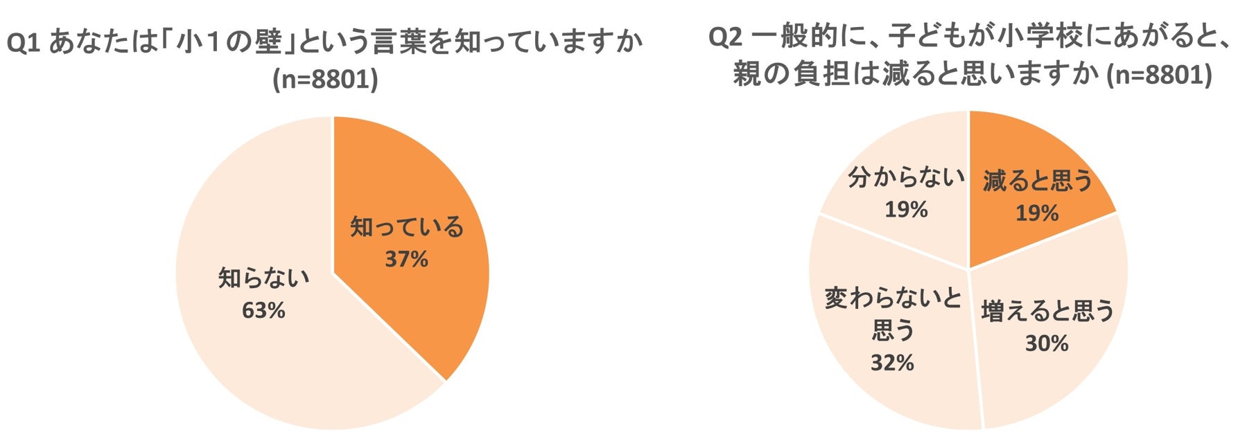 全国の20~50代の男女8801名にアンケート調査を実施したところ、「小1の壁」という言葉を知っていたのはわずか37%のみでした(Q1)。子どもが小学校にあがると親の負担は減ると思うか聞いたところ、30%が「増える」と回答した一方で19%は「減る」と回答(Q2)。まだまだ「小1の壁」に対する世の中の理解が追い付いていない実態が明らかになりました。