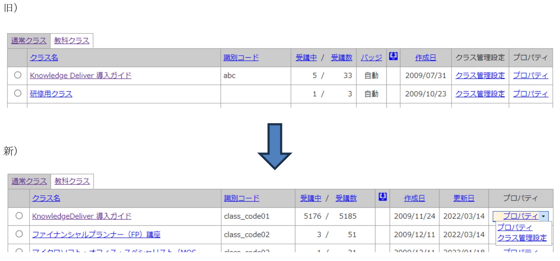 システム管理 > クラス管理 画面におけるクラス一覧の表示項目に更新日を追加しました。関連して、従来の一覧にあった「クラス管理設定」項目は「プロパティ」傘下に内包しました。「プロパティ」右の▼をクリックして表示するリンクリストから「クラス管理設定」を選択し、クラスマネージャ、メンター、チューターの機能権限設定画面に遷移できるようになりました。