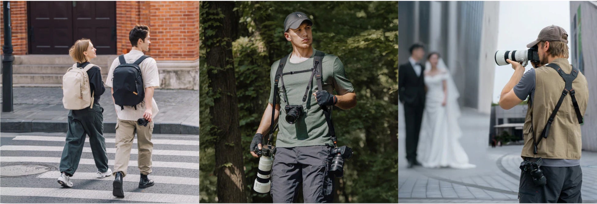 最大3台のカメラ機材を同時に安定して装着できる、商業撮影にも対応したデュアルショルダータイプのストラップ。Dリングによる柔軟な拡張性に加え、通気性に優れた幅広パッドで肩への負担を軽減します。AutoFit機構により、肩幅に応じてパッドが自動でフィットします。