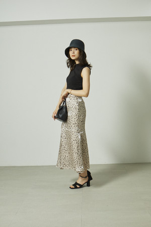 秋のムードを先取りするアニマル風ドットをプリントしたバリエーションスカート。腰周りはすっきりと、裾にかけて広がるナローシルエットがレディな印象の1枚です。シンプルなルックスながら、光沢感の強いサテンを使用することで一味違った新鮮さを表現しました。バックウエストゴムが着心地を快適に、透け防止の裏地が付いているので1枚で穿ける安心感のある仕様です。