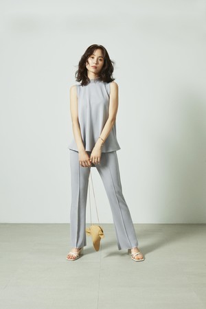 イージーな穿き心地と美しいシルエットを兼ね備えたカットソーパンツに、ボウタイフリルブラウスを合わせたコーディネート。きちんと感と程良いフェミニンさのミックスが、クラシカルな印象を与えます。また、リブを太めにとったハイウエストのパンツは、裾にかけて広がるフレアが脚を細長く見せ、スタイルアップを叶えます。